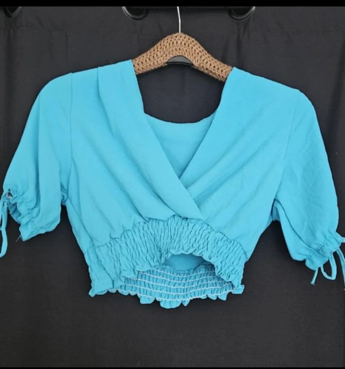 t-shirt court s'arrêtant au dessus du nombril, élastiques au niveau du ventre et des bras