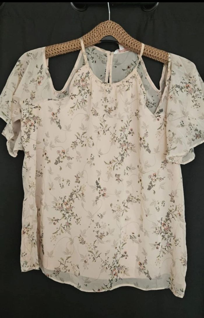top rose à motifs florales, bouton à l'arrière du cou, les manches tombent sur les épaules donnant un effet de voilage, doublure en dessous du top également