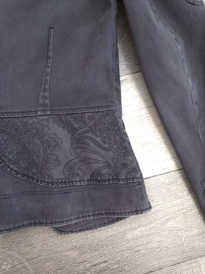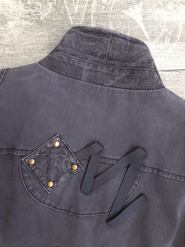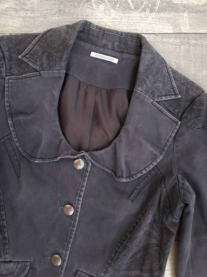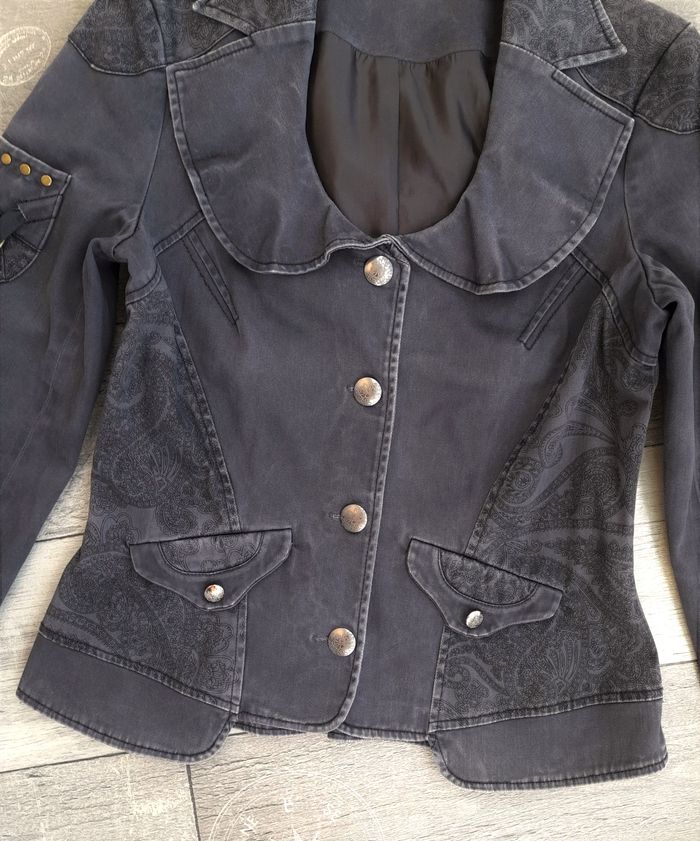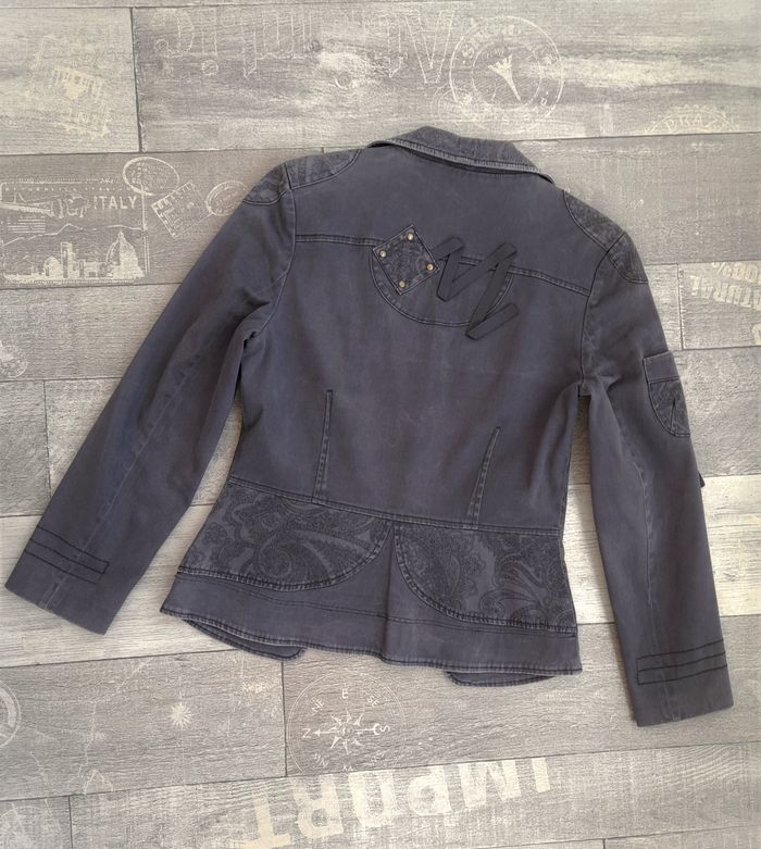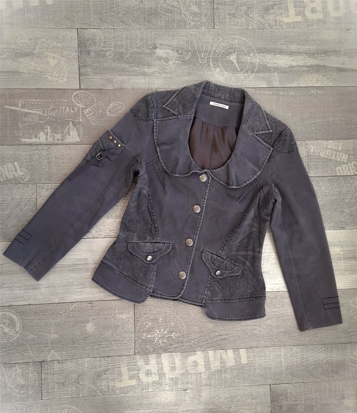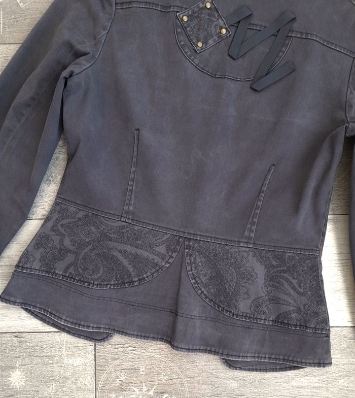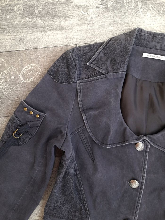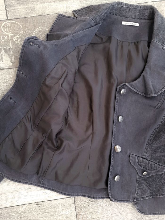 Veste à fantaisie demi-saison - Perspective • 2 fausses poches • Diverses fantaisies • Matière douce en stretch • Coloris bleu-gris • Taille 38 ➥ Un peu délavée sur les contours ➥ Valeur 45€ • Largeur épaule 40 cm • Largeur aisselle 48 cm • Longueur totale 58 cm