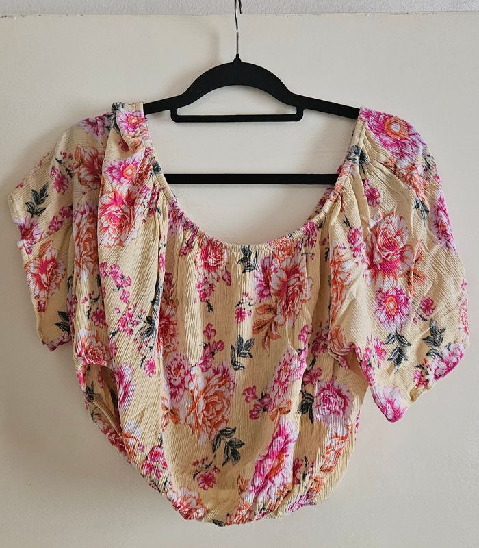 t-shirt court jaune à motifs florales roses, élastiques au niveau du ventre, des épaules et du cou