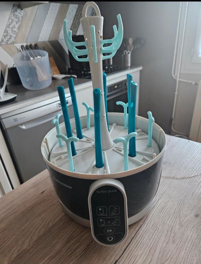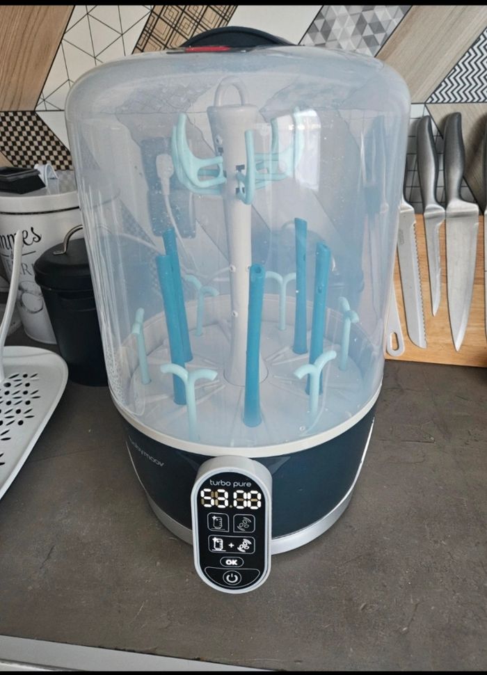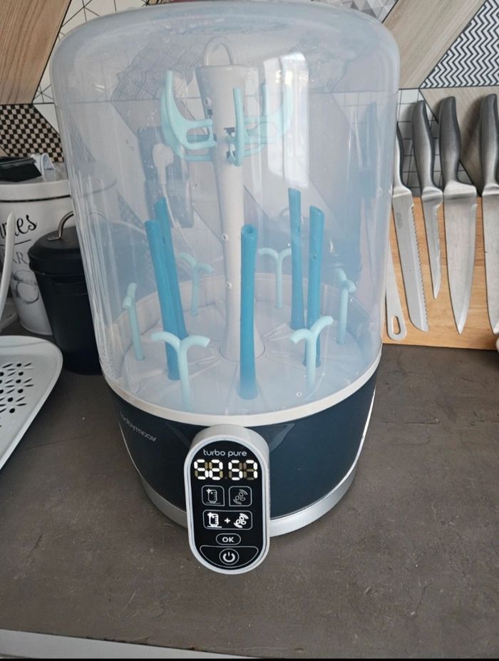 Vends sterilisateur babymoov séchant. Plusieurs programmes. Fonctionne très bien. Détartré toutes les semaines au vinaigre blanc. Utilisé 2 mois. Une pâte ne tient plus mais cela ne gêne pas son fonctionnement.
