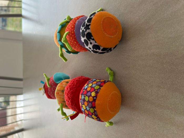 Jouet chenille en tissu pour bébé. Les morceaux se séparent et se recollent grâces aux scratchs. Différentes couleurs, textures, sons et motifs idéal pour l'éveil de bébé.