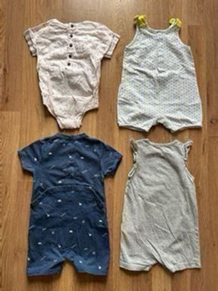 Vends un lot de 4 vêtements été de diverses marques en 9 mois en très bon état -1 Combinaison bleu marine kiabi en 9 mois -1 combinaison grise et verte claire à motifs Obaïbi 9 mois -1 body combinaison rose clair kiabi 9 mois -1 combinaison grise Disney le roi lion 9/12 mois