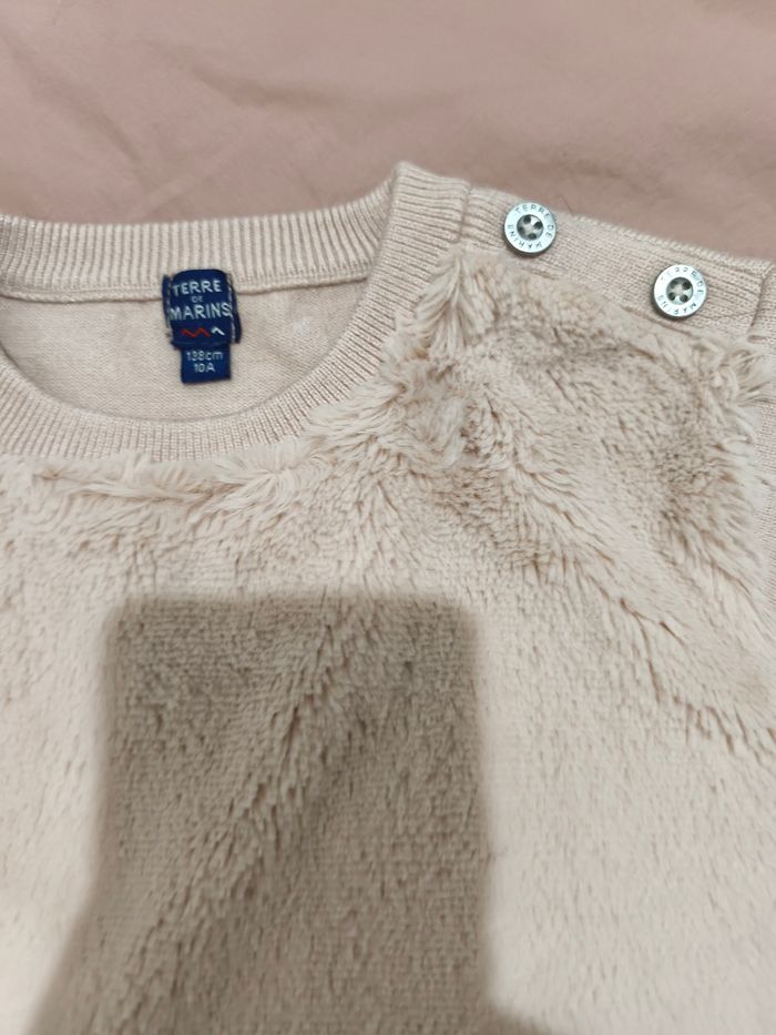Pull rose pâle. Effet moumoute très doux devant. Taille 10ans/138cm. Boutons à l épaule en décoration