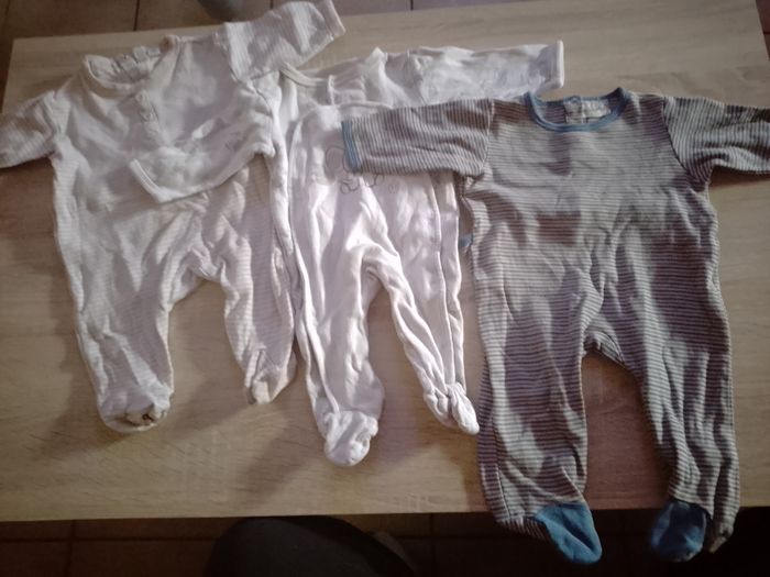 Pyjama 3 mois en très bon état ormis un où il manque 1 bouton en haut du pyjama comme sur la photo.