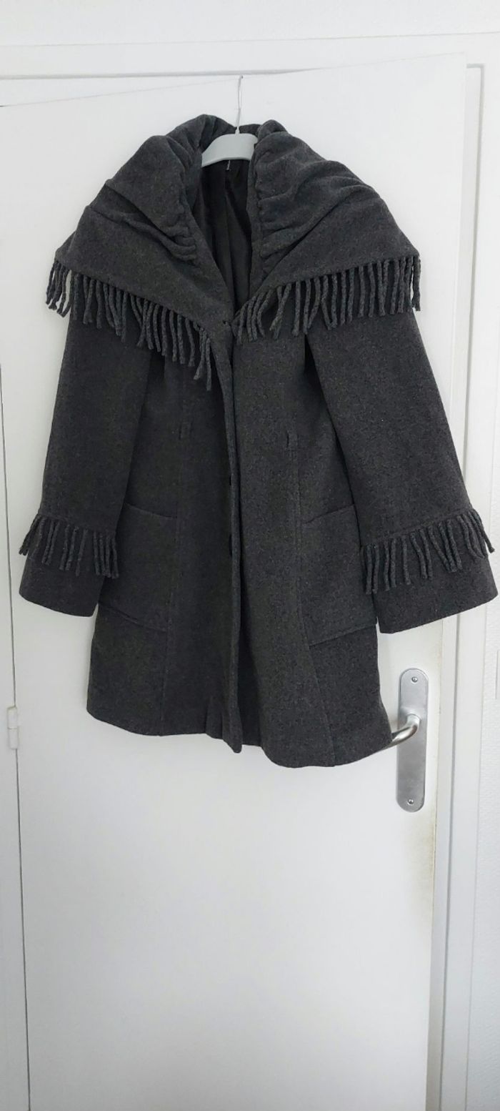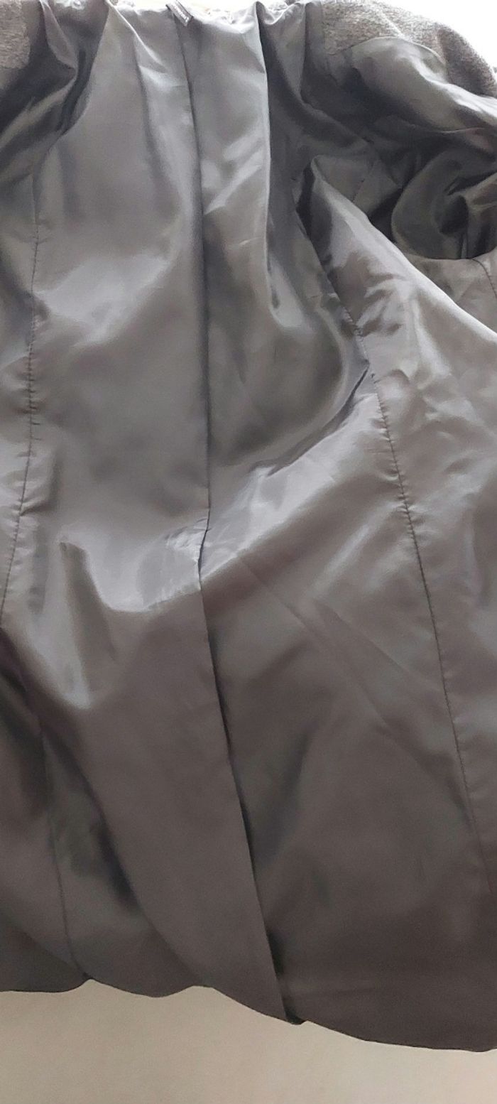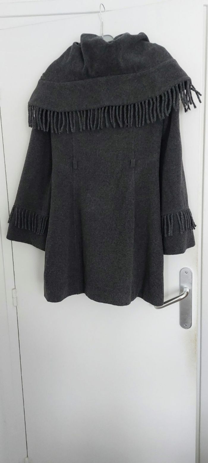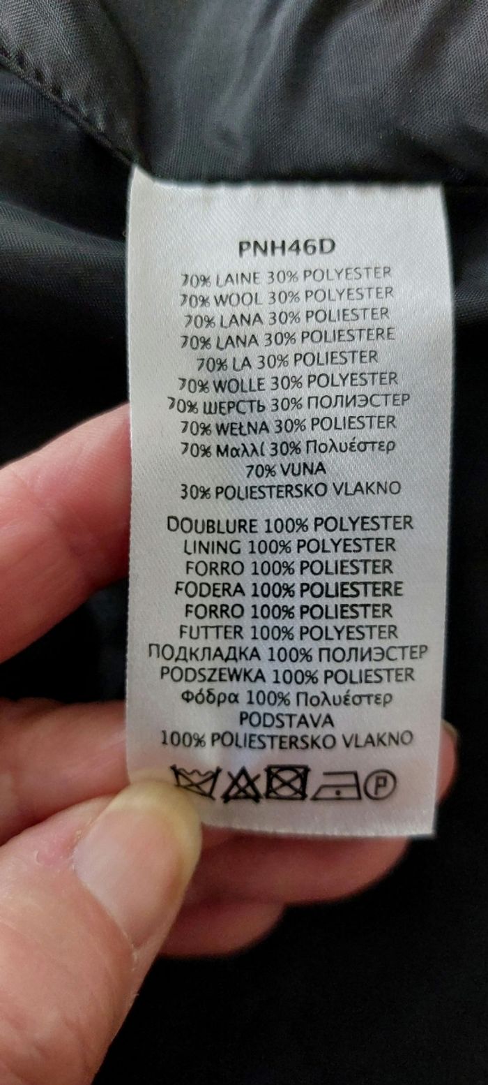 Peu porté. Il manque la ceinture. 70% laine et 30% polyester. 100% polyester pour la doublure.