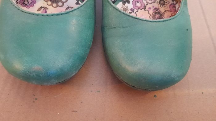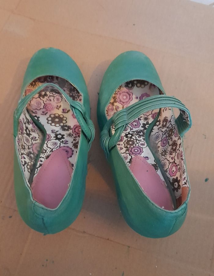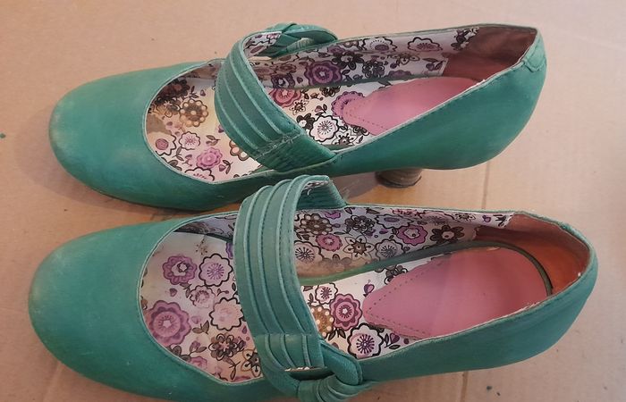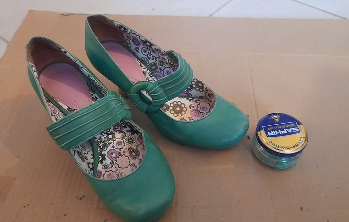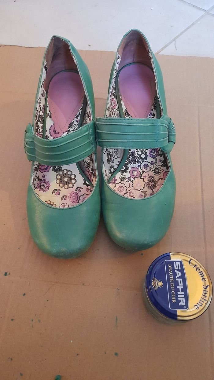Paire de chaussures à talons Hauteur talon: 6.5 cm Pointure 38 Photos: Semelles extérieures et intérieures en bon état Devant chaussures: un peu abîmés Arrière chaussures et talons: un peu abîmés. Vendues avec le cirage correspondant marque Saphir. Quantité restante visible sur 2 photos. Vendues sans la boîte d'origine.