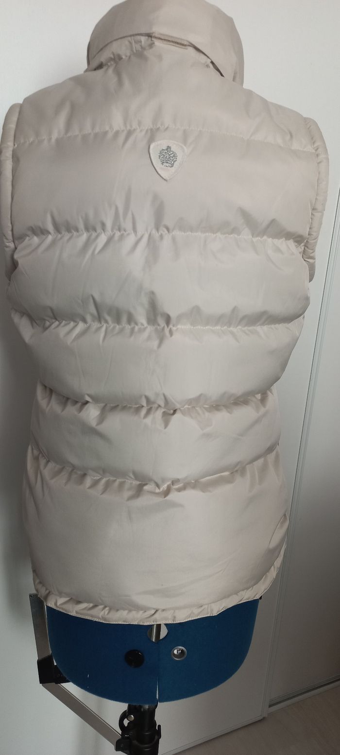 Doudoune sans manches, beige Bien etudiee : Imperméable, doublée polaire, capuche dans le col, broderie poitrine et patch au dos. Sans défaut pas de tache, ni accroc. Entretien facile : passe en machine a 30° Taille 36 / S, notée M qui taille petit, voir dimensions : Largeur sous bras : 45 cm Hauteur 60 cm Envoi rapide et toujours soigneusement emballé