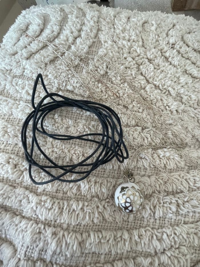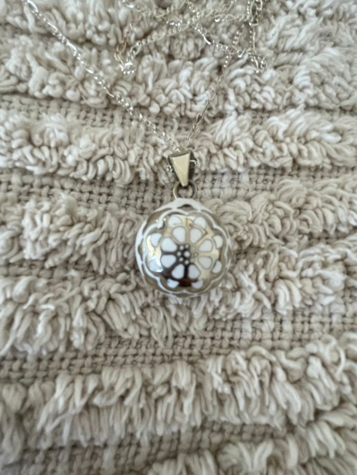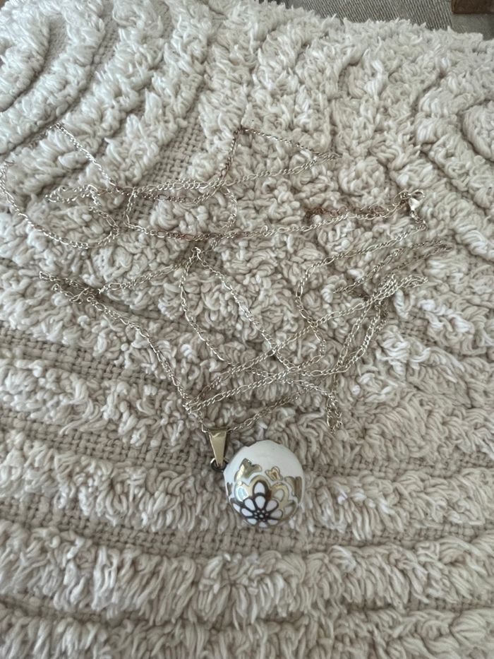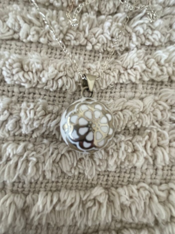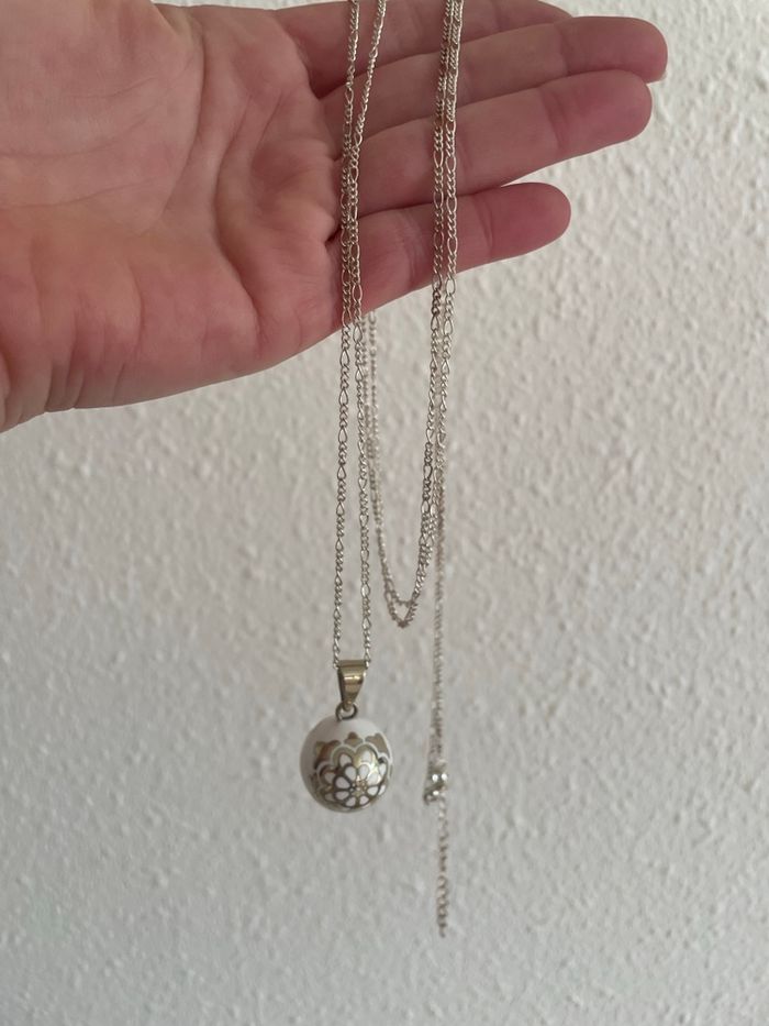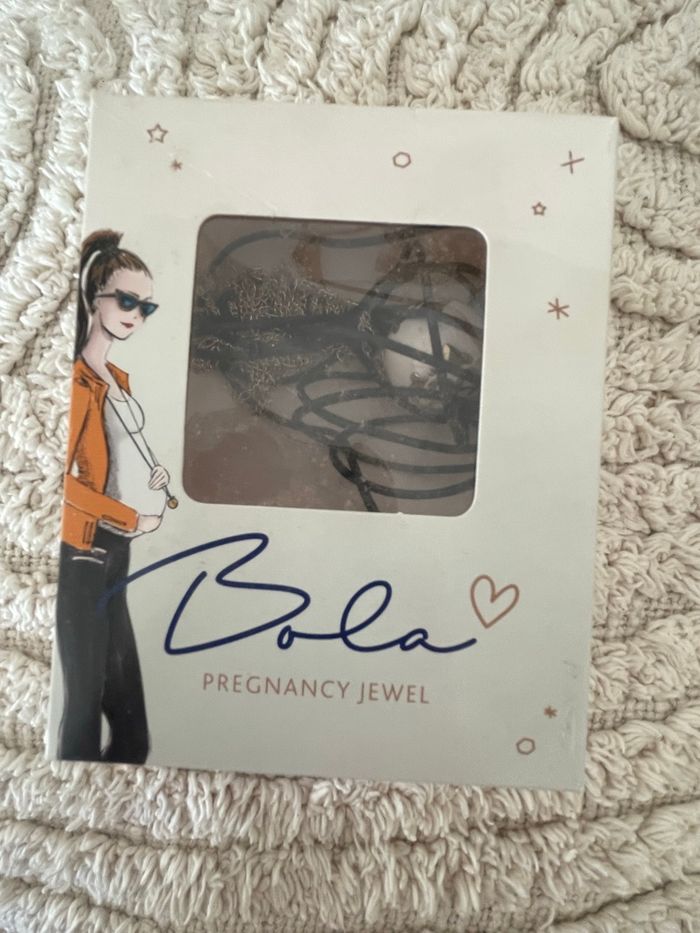 Bola de grossesse dans sa boîte et sac d’origine A été peu porté Vendu avec une chaîne en argent qui fait 1m40m Idéal pour une femme mesurant plus de 1m65 Couleur blanc et argenté