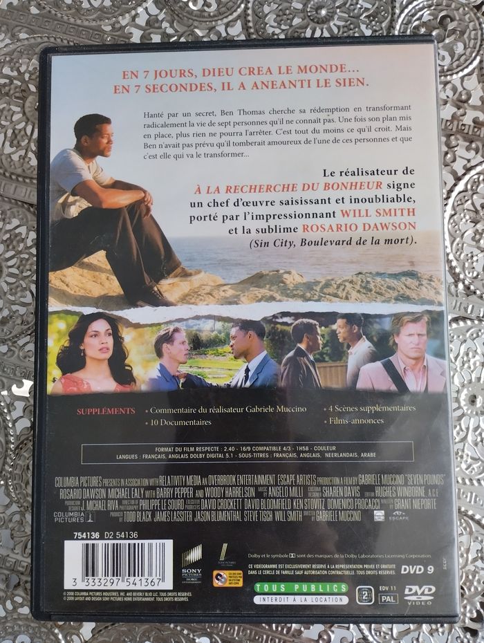 Je vends le film "Sept vies" avec Will Smith en DVD. - Type de produit : DVD - Titre : Sept vies - Réalisateur : Gabriele Muccino - Acteurs principaux : Will Smith, Rosario Dawson Bon état. N'hésitez pas à me contacter pour plus d'informations.