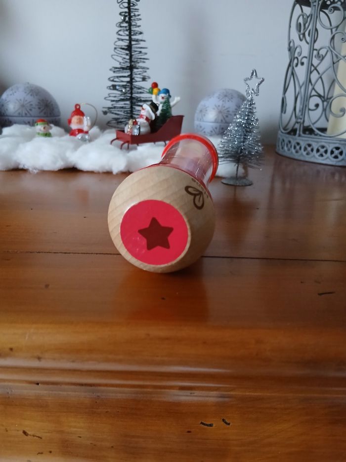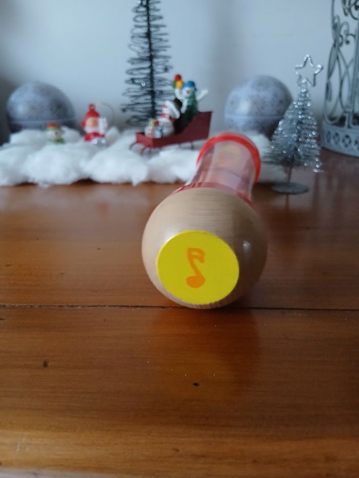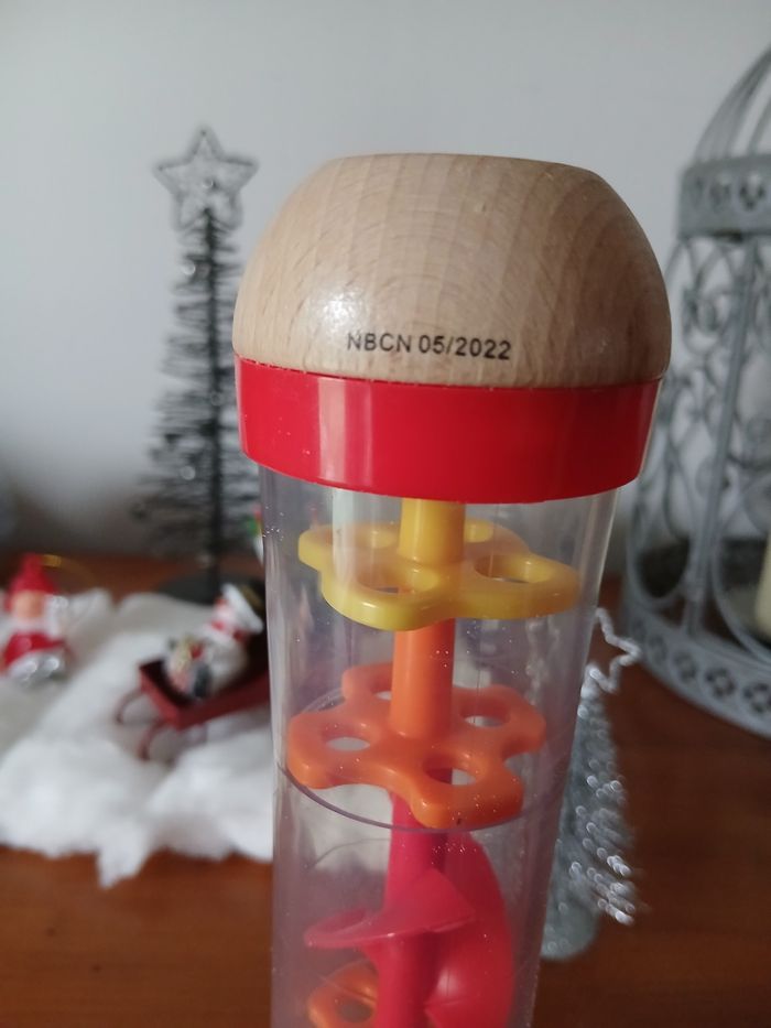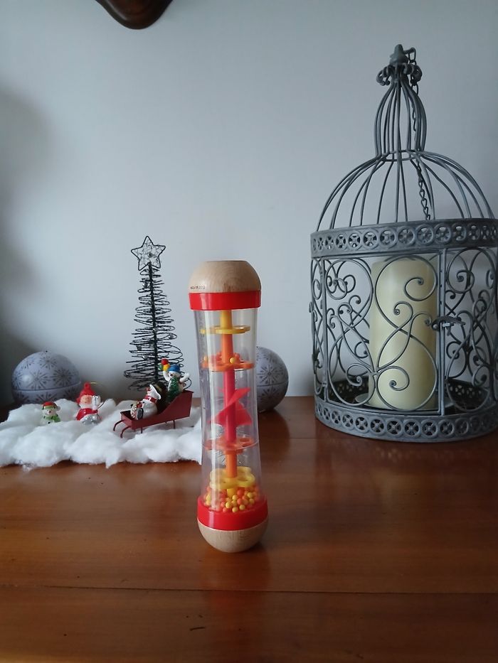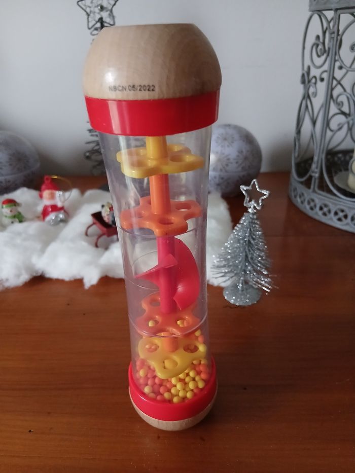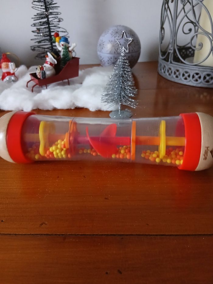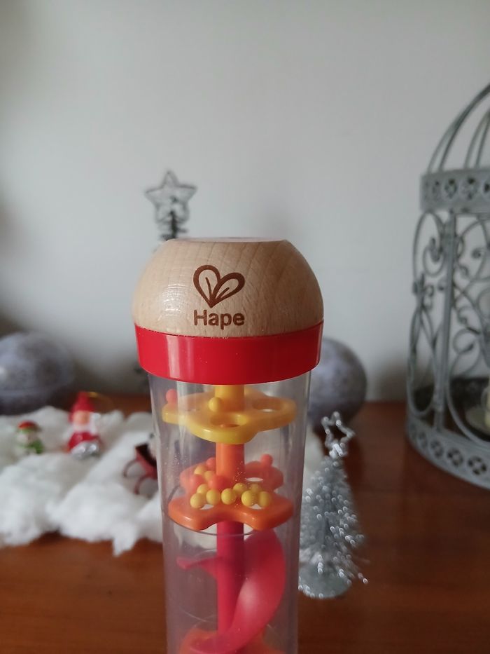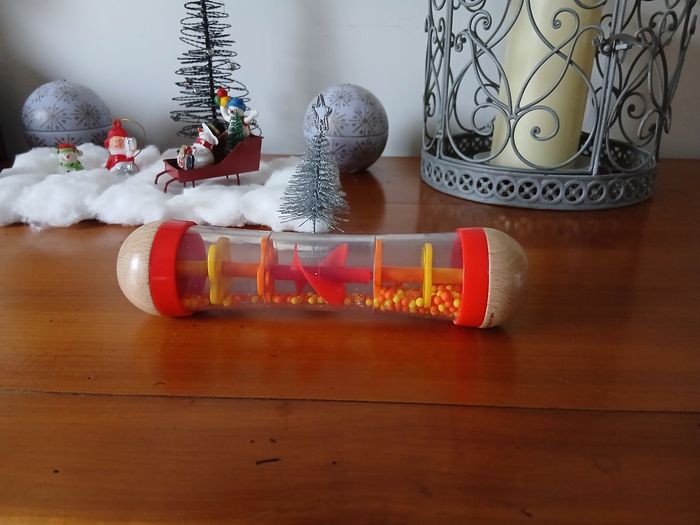 Bâton de pluie marque Hape. Embouts en bois massifs; corps en plastique dur transparent; système intérieur ( avec hélice ) et petites billes en plastique. Hauteur maxi de 18,5 cm // voir photos pour détails