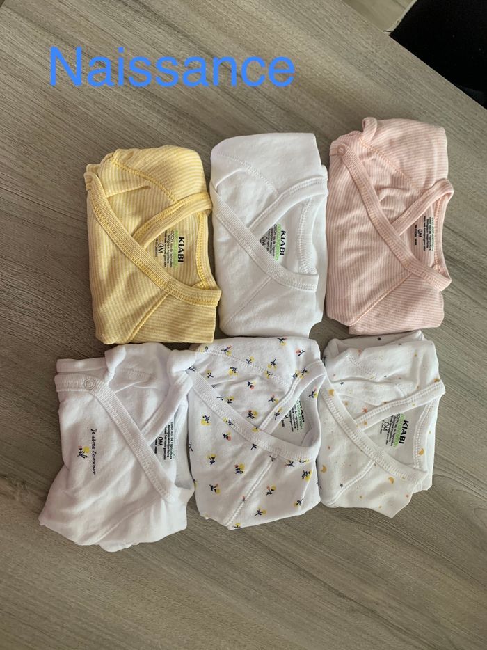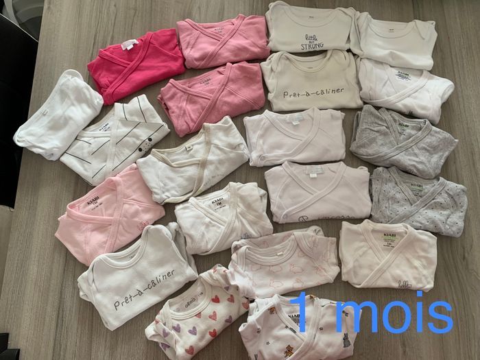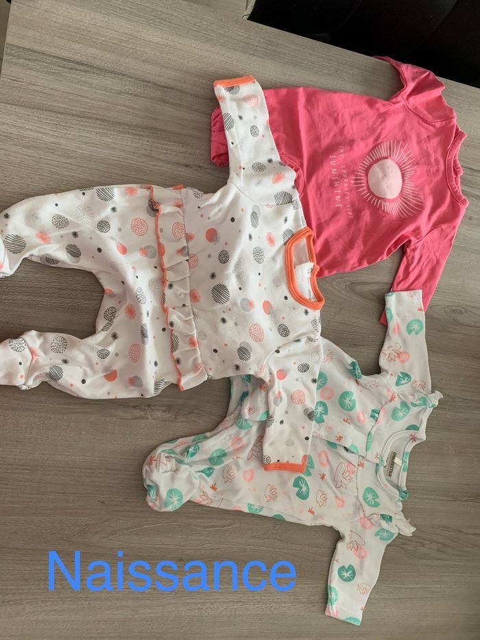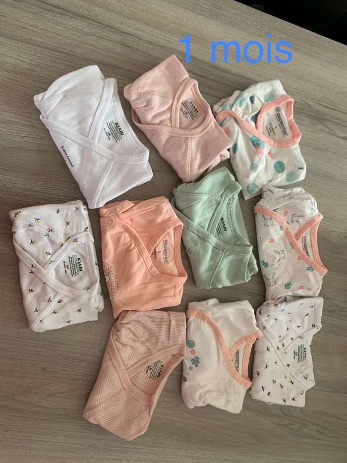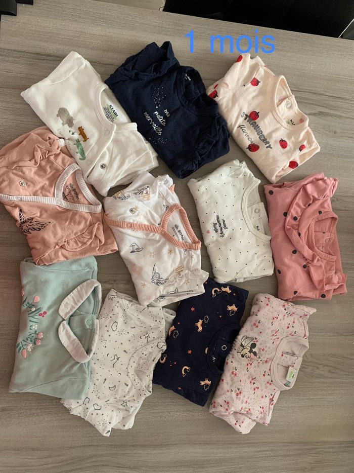 Bonjour je vend des lots de vêtements filles Lot vêtements naissance : (20€) - 2 bodys manche longue - 6 bodys manche courte - 1 ensemble body/pantalon - 3 pyjamas coton Lot vêtements 1 mois : (50€) - 21 bodys manche longue - 10 bodys manche courte - 11 pyjamas coton
