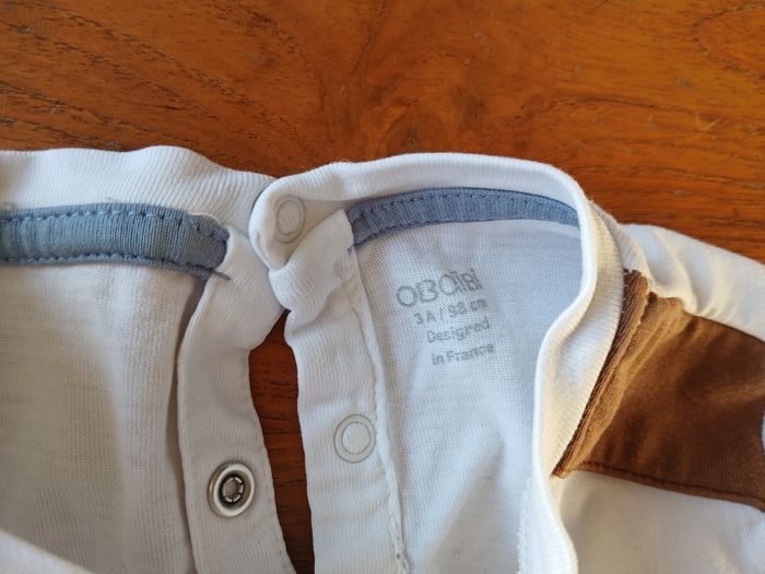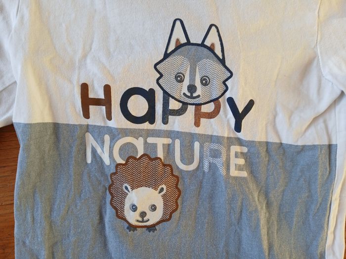T-shirt à manches longues blanc et bleu de la marque Obaibi. Marqué "Happy Nature" avec dessins d'un hérisson et d'un loup. Taille 3 ans / 98 cm Très bon état