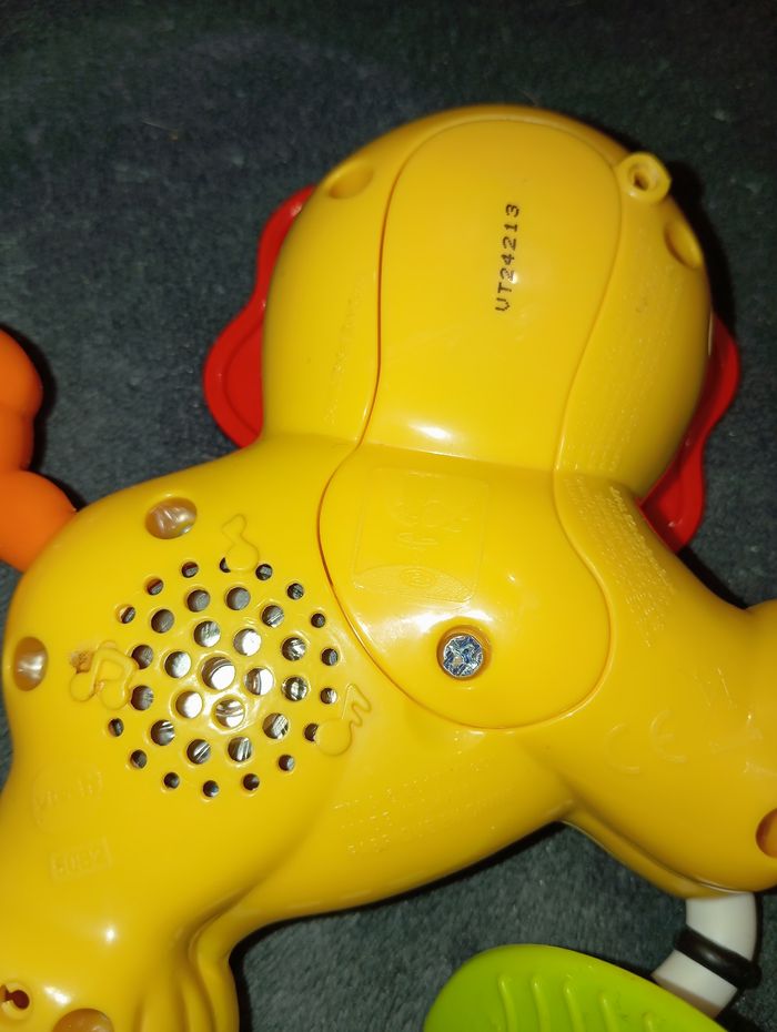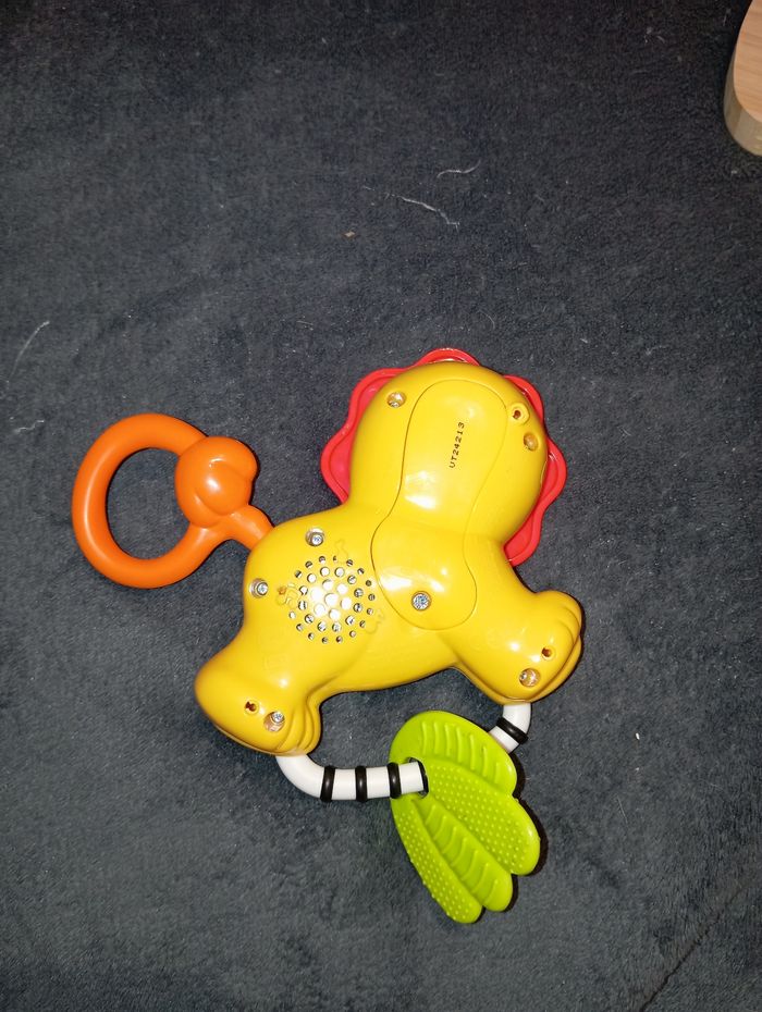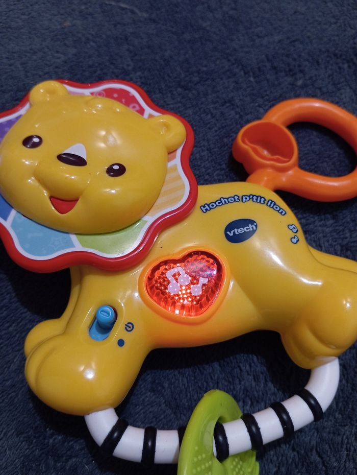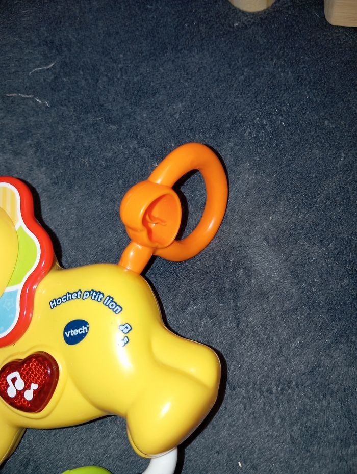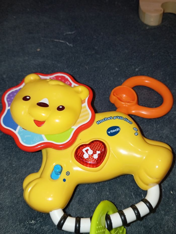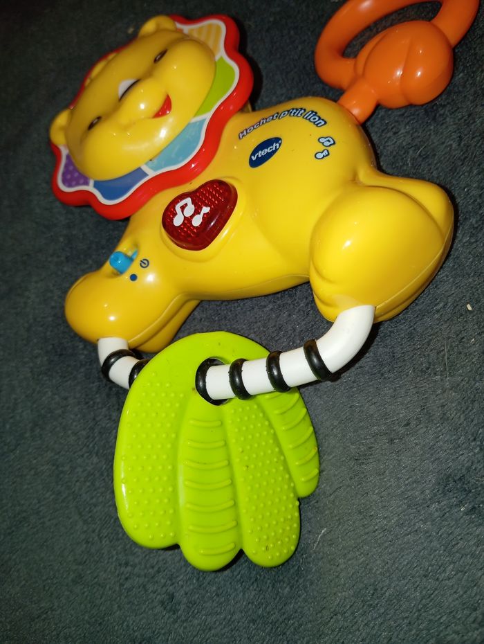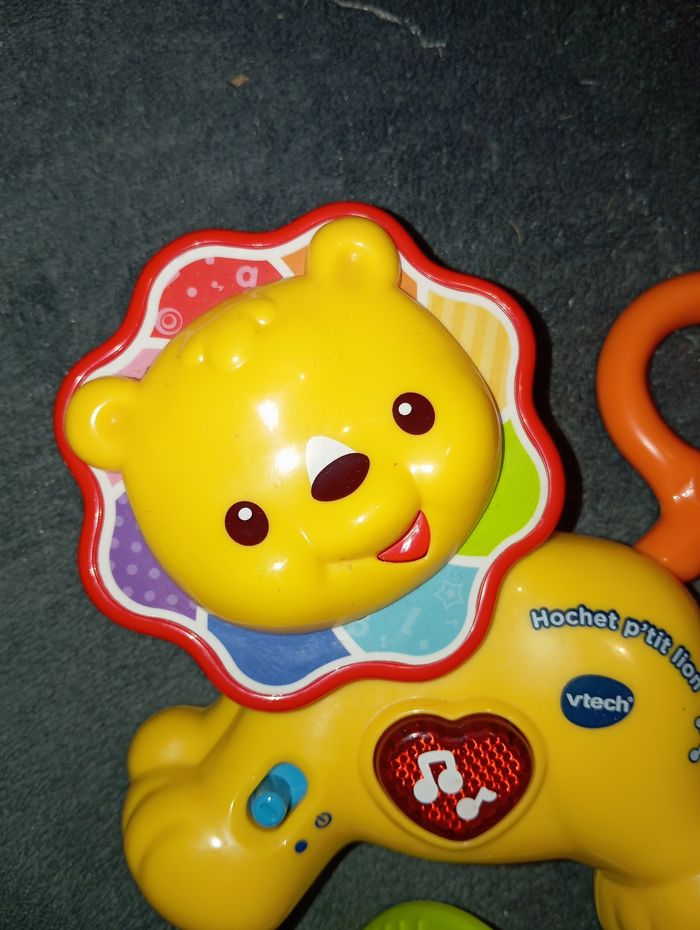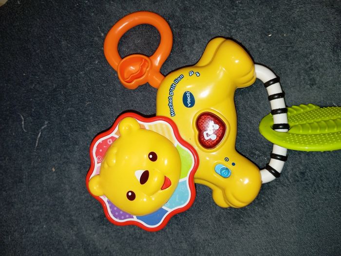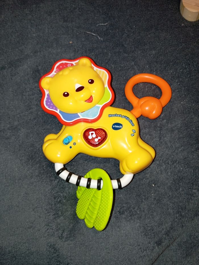 Hochet P'tit Lion de chez VTech Très bon état, fonctionne à piles Chantes, parle... Sa tête et sa queue tournent et font du bruit Comme neuf, peu servi, l'anneau de dentition n'a jamais été mâchouillé Maison non fumeur
