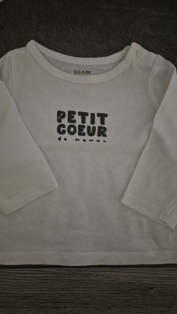 Vend ce tee-shirt manches longues en très bon état mixte et en taille 1 mois, de marque kiabi