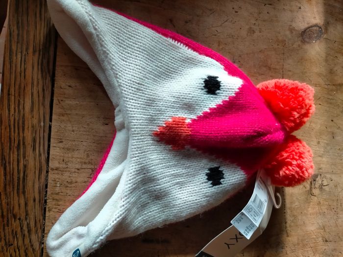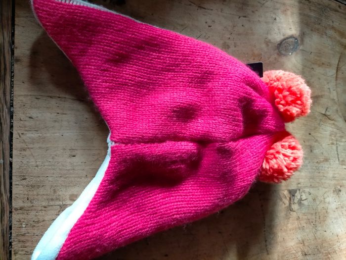 Neuf avec étiquette. Bonnet avec pompons doublé de polaire écrue très chaude.