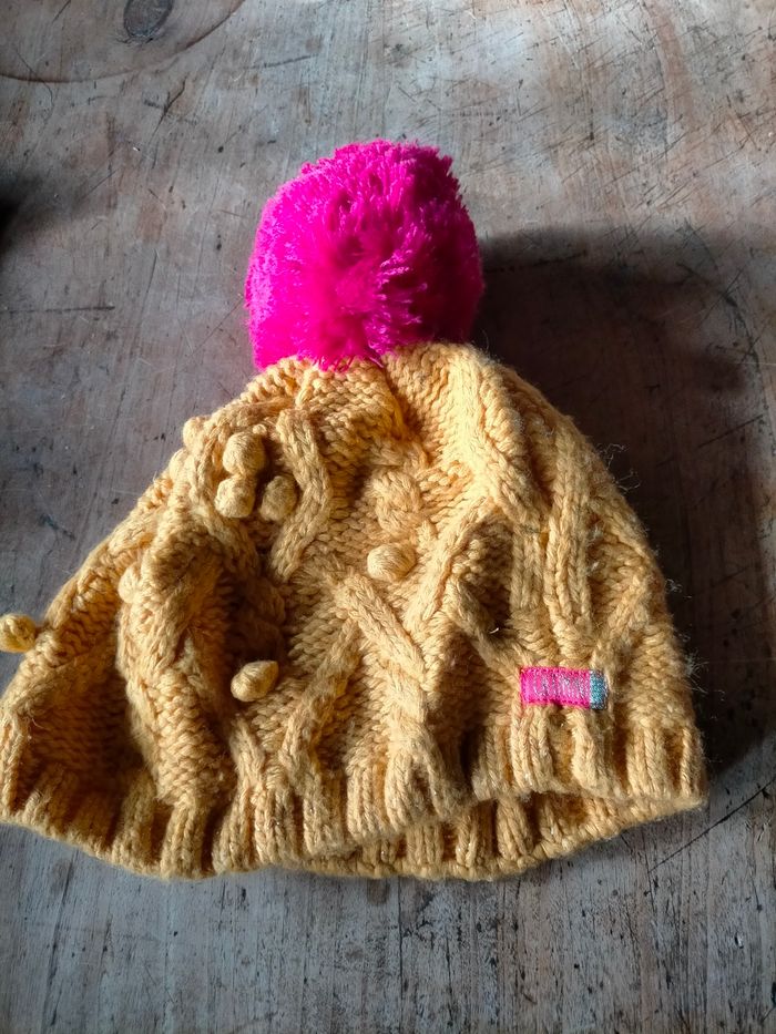 TBE joli bonnet en maille épaisse et chaude jaune moutarde à pompon fuchsia. Étiquette catimini devant