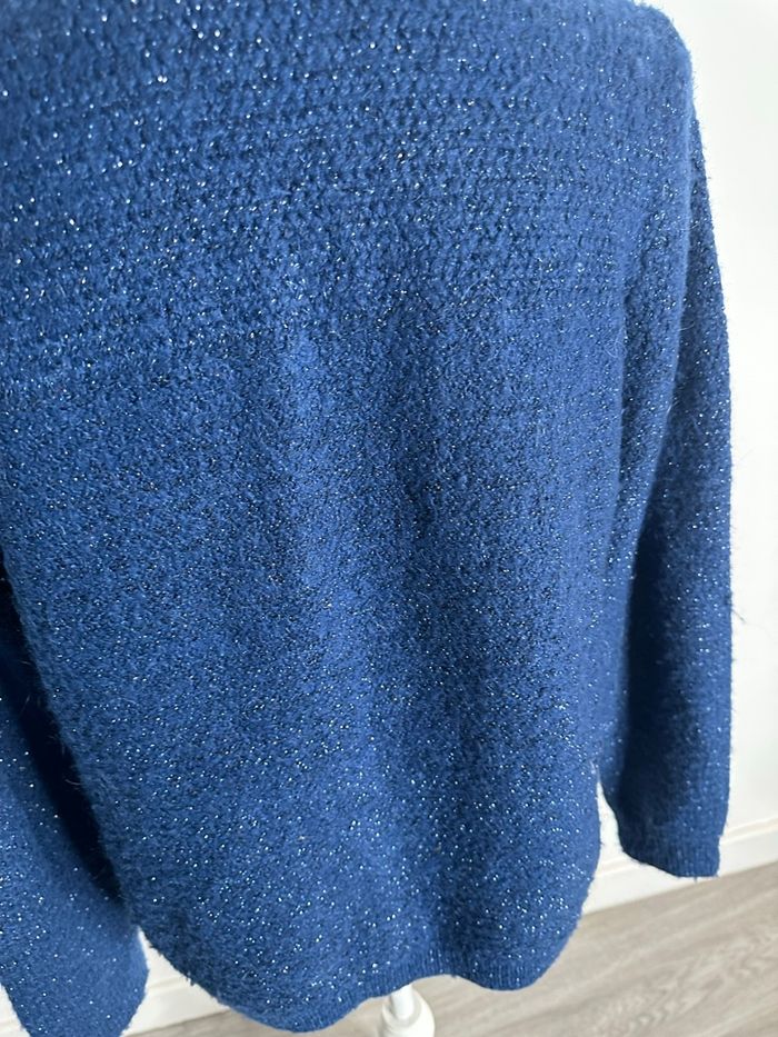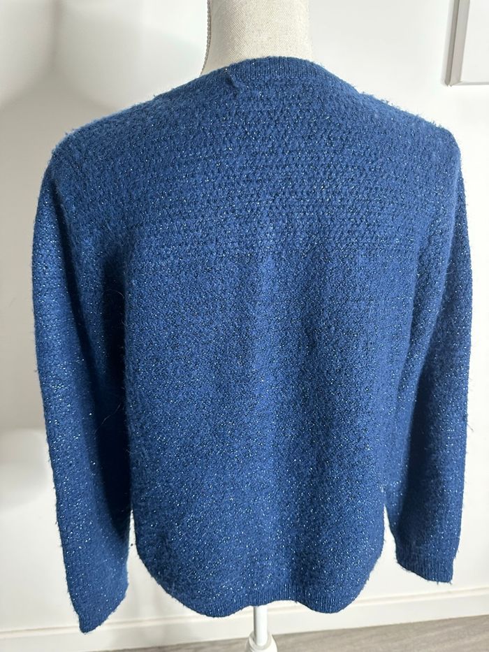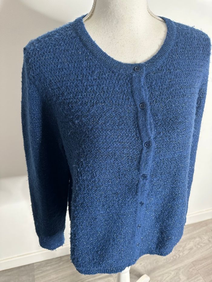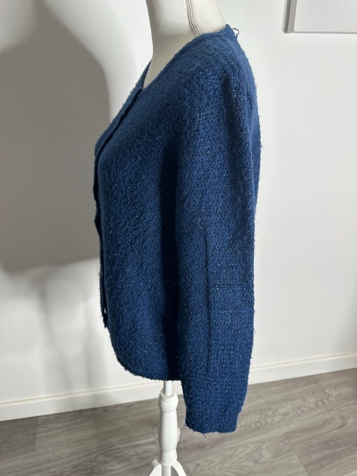 Cardigan - Excellent état - Taille 3 équivalent 40 L Dimensions en bas de l’annonce - Bleu marine et argenté - Se ferme avec des boutons - Modèle diamant - Prix d’achat: 69€ - Pas d’étiquette de matière mais j’ai trouvé la composition en ligne: 54% polyester, 15% fibres métallisées, 11% polyamide, 11% acrylique, 6% laine, 3% élasthanne Dimensions: - 40cm niveau épaules - 55cm niveau aisselles - 60cm de long