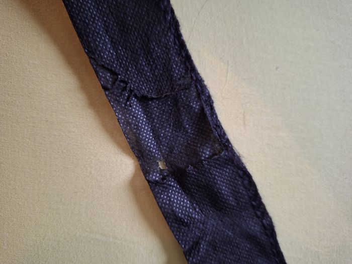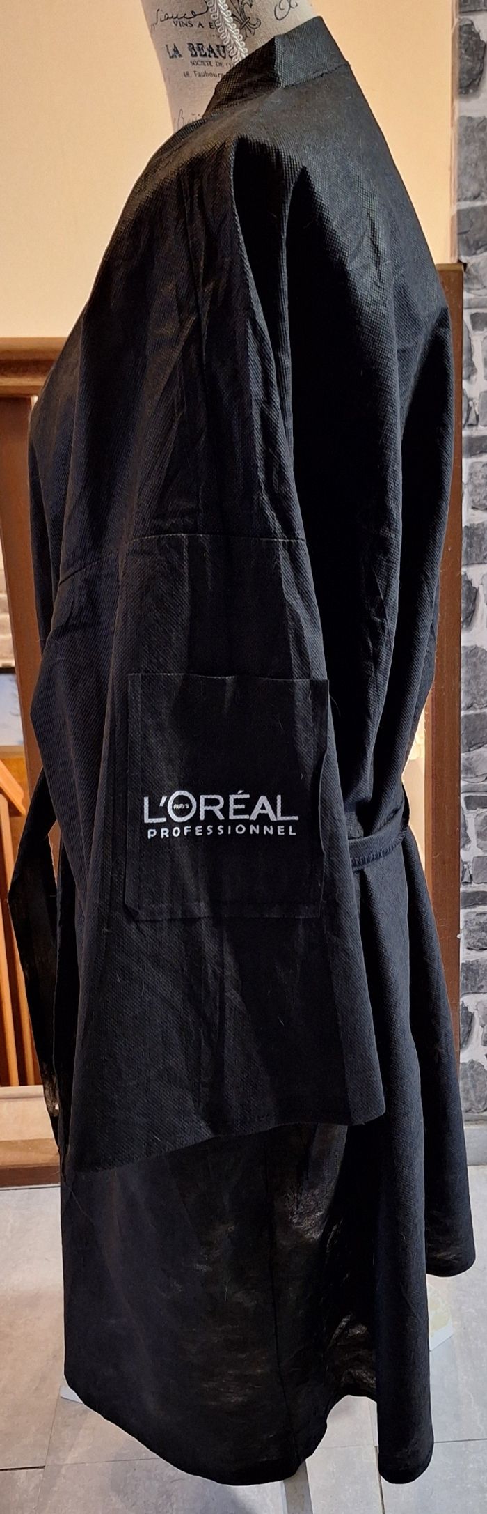 Blouse de coiffeur en papier noir avec une poche sur la manche gauche. Ceinture à l'extrêmité un peu abîmée. Hauteur 100 cm.