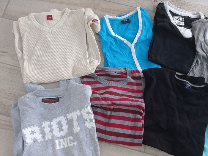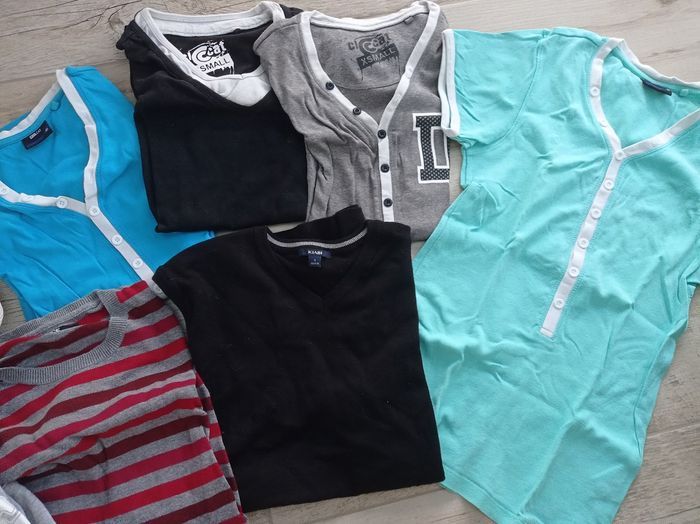 4 tee-shirts "Cool Cat" XS 1 sweat "Cool Cat" S 1 pull noir "Kiabi" S 1 pull "Brice" S 1 pull écru "Célio" S Bon état. Petit prix.