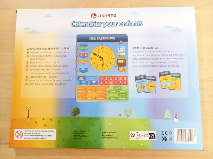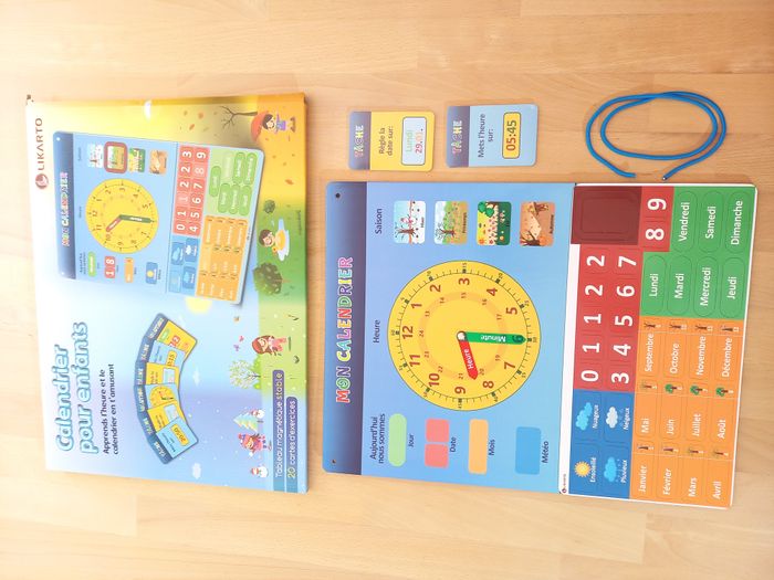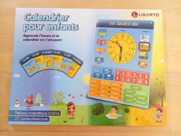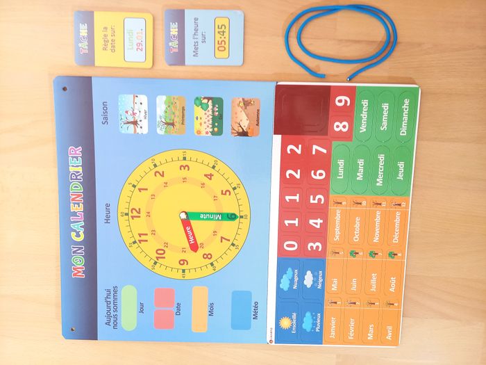 Calendrier magnétique pour apprendre à se servir d'un calendrier ET pour apprendre l'heure, les saisons, les jours de la semaine, les mois de l'année et la météo! Ce calendrier entre dans le cadre de la pédagogie Montessori. Autres articles d'inspiration Montessori: #JoujouXmontessori 🔍​ Description: ✨ Etat: Jamais utilisé, ouvert uniquement pour prendre les photos de l'annonce ✨​ Thème: Apprentissage de l'heure / les jours de la semaine/ les mois de l'année / activité Montessori ✨​ Age: Dès 3 ans 📏 Dimensions: 42 x 32 cm 🧲 36 aimants + 20 cartes d'entrainement: 🔢 les chiffres de 0 à 7 (12 aimants) 📆​ les 7 jours de la semaine 📅 les 12 mois de l'année 🌤️ 4 aimants météo 🌳​ 1 cadre magnétique pour sélectionner la saison 🕐 10 cartes apprendre l'heure 📆​ 10 cartes apprendre à se servir du calendrier ⚠️ Il ne s'agit pas de la marque Montessori mais d'un jeu s'inspirant de cette pédagogie. 🔍 Descriptif complet: 🕑​ Apprendre l'heure et à se servir d'un calendrier de manière ludique: Ce calendrier magnétique transforme l'apprentissage en une expérience interactive. Les enfants peuvent découvrir l'heure et le calendrier de façon ludique. Grâce aux aiguilles mobiles, ils apprennent à lire l'heure avec assurance. ✔️​ De nombreux aimants et cartes pour s'entrainer: 36 aimants inclus et 20 cartes d'exercices pour un apprentissage varié et ludique. Les cartes facilitent l'apprentissage du calendrier et de l'heure de manière intuitive. ​🛡️ Qualité et durabilité: Particulièrement stable et résistant grâce au tableau magnétique robuste (42 cm x 32 cm) et aux aimants puissants. Ce calendrier pour enfants est conçu pour permettre inscriptions et effacements multiples. 👦​👧​ Développement des enfants: Grâce à son design adapté aux enfants, il est facile à comprendre et amusant à utiliser. Il favorise ainsi l'apprentissage autonome et la compréhension. 🚚​ Expédition rapide par Mondial Relay ou Colissimo à votre convenance!