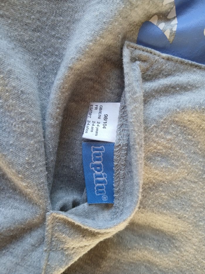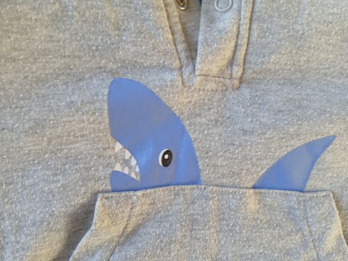 Polaire gris, poche ventrale avec dessin d'un requin. Doublé bleu. Marque Lupilu. Taille 2 - 4 ans Bon état, un peu peluché.