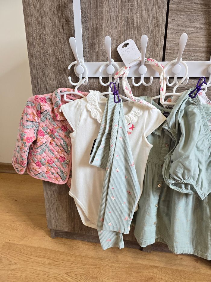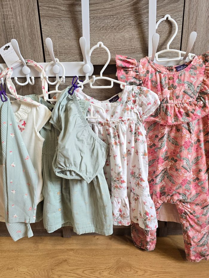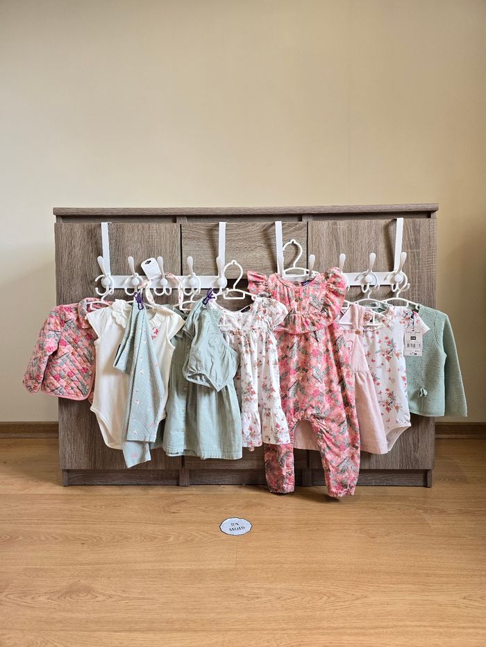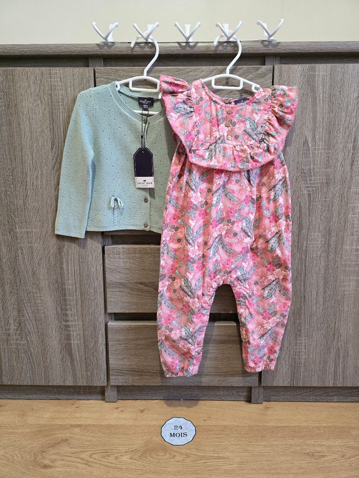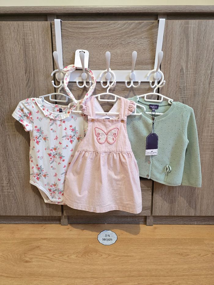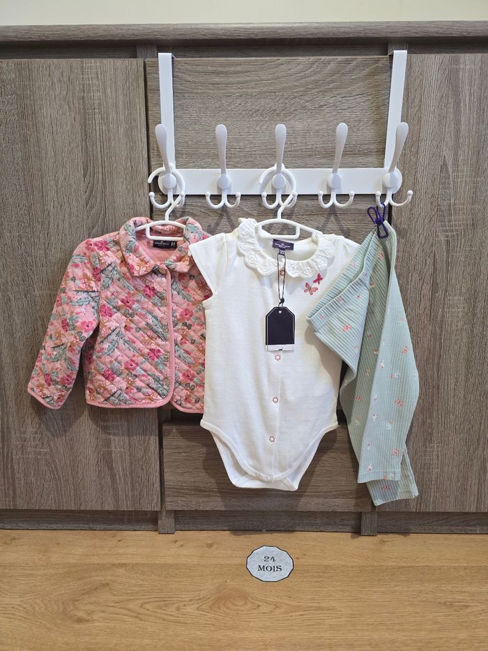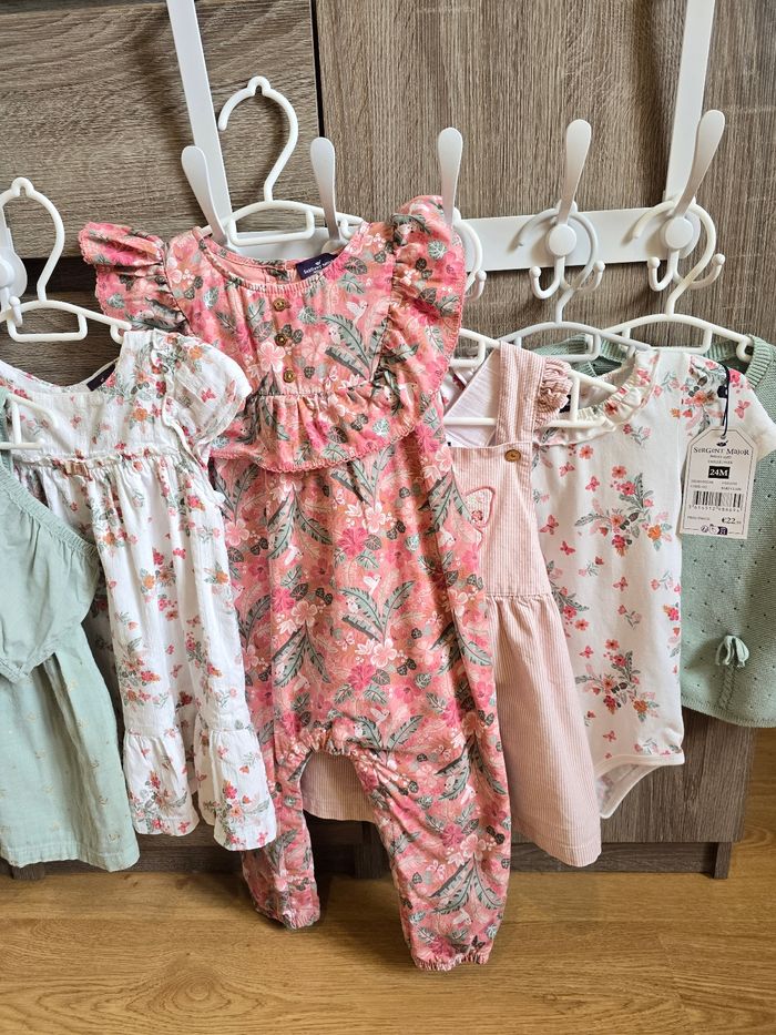 Lien direct vers les tailles équivalentes dans mon dressing : #fdhsarah24mois #fdhsarahSGMJ 📜 Lot comprenant : - Combinaison rose fleurie rose et palmiers. Ouverture à l’arrière par des boutons dorées et boutons pressions en l’entrejambe. Ref : FAINES - Robe légère à manches courtes volantées. Fond blanc cassé avec un imprimé floral dans des tons de rose, corail et vert. Ref : FAIRIS - Gilet/Cardigan en maille de couleur vert d'eau (menthe). Il présente des détails de tricot ajouré (pointillés) et un petit nœud décoratif sur le bas. Ref : FAILONI - Robe chasuble rose pâle à fines rayures verticales et un grand motif papillon brodé sur le devant et des volants aux emmanchures. Ref : FAIRANNA - Body blanc à manches courtes avec un imprimé floral et papillons dans les tons roses et col Claudine. Ref : FAIRANNA - Serre-tête au même motif que le body Ref : FEBLUETTE - Veste Matelassée Fleurie avec un col chemise, imprimé floral printanier dans les tons roses et verts sur fond rose pâle. Finition matelassée avec surpiqûres. Ref : FAIMIMI - Body chemisier à col Claudine blanc avec petit imprimé papillons roses. Ref : FAISIS - Legging couleur vert d'eau / Menthe pastel avec des imprimés papillons, perroquet et libellules roses. Ref : FAISTEL - Robe + bloomer couleur menthe avec des petites fleurs dorées Ref : FAIMA Collection : Mon voisin le perroquet Taille 📏 : 24 mois 86 cm État 🔍 : Très bon état et neuf avec étiquette Marque 🏷️ : Sergent Major Je suis disponible pour toutes questions ou photos supplémentaires. 📦 L’envoi se fait le plus rapidement possible Autres plate-formes : Beebs et Leboncoin. Bon Shopping