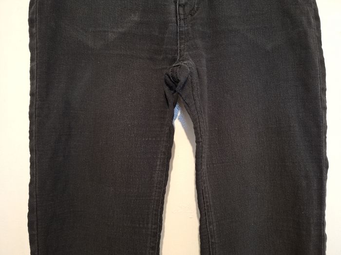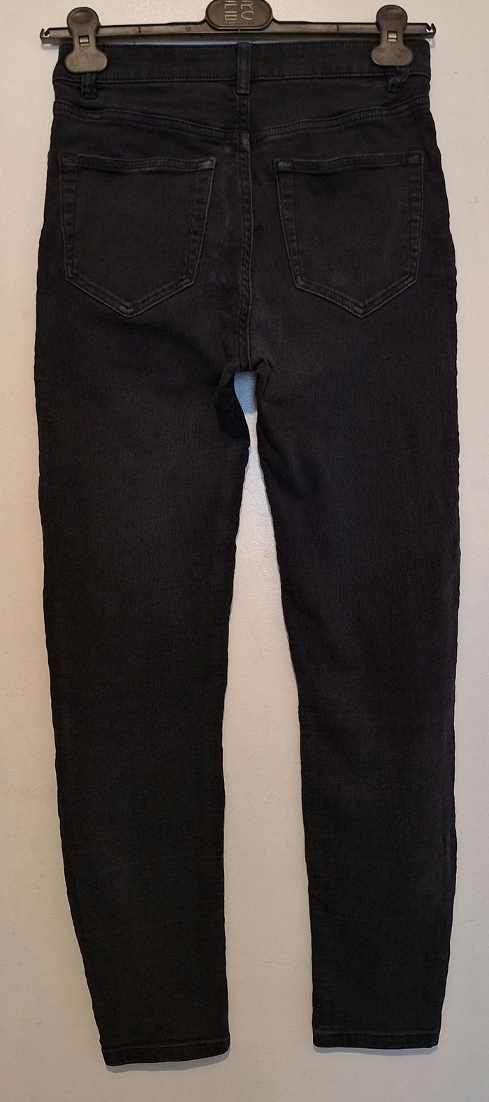 Jean noir porté mais qui peut largement avoir une seconde vie. Elasthanne. Fausses poches devant. Vraies poches derrière, Passants pour ceinture. Fermé par bouton et Zip.