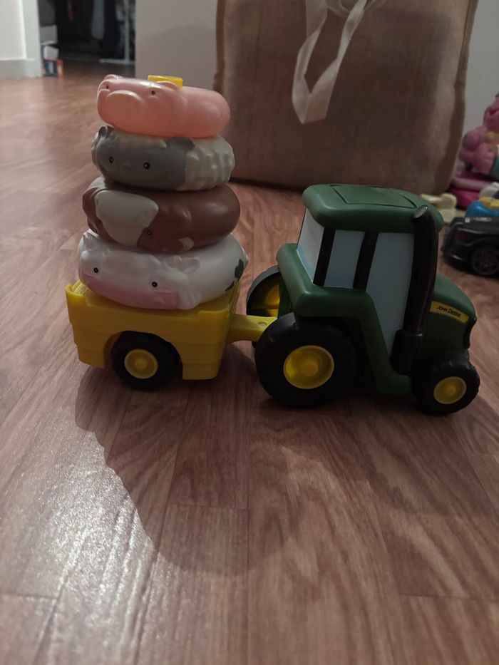 Petit tracteur qui tracte une remorque avec des animaux à empiler. Les animaux tournent quand le tracteur avance. Le tracteur fait du bruit quand on appuie sur un bouton