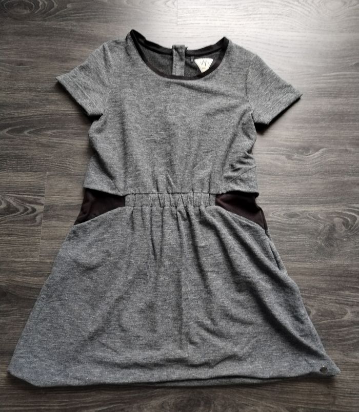 Jolie robe grise et noire. Manches courtes, effet resserré à la taille avec côtés noirs. Taille : 14 ans XS Marque : IKKS Très bon état
