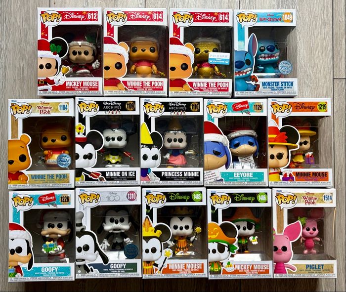 - Holiday 612 Mickey Mouse 15€ - Winnie L’ourson 614 Winnie The Pooh 15€ - Winnie L’ourson 614 Winnie The Pooh (Stickers Funko Primark Exclusive) 20€ - 1049 Monster Stitch (Stickers Funko Exclusive) 16€ - Winnie L’ourson 1104 Winnie The Pooh (Stickers Funko Exclusive) 16€ - Walt Disney Archives 1109 Minnie On Ice 15€ - Walt Disney Archives 1110 Princess Minnie 15€ - Holiday Bourriquet 1129 Eeyore 17€ - Halloween 1219 Minnie Mouse 15€ - Holiday 1226 Goofy 16€ - Disney 100 1310 Goofy (Stickers Funko Exclusive) 16€ - Halloween 1485 Minnie Mouse 16€ - Halloween 1486 Mickey Mouse 16€ - Winnie The Pooh 1514 Piglet 18€ À vendre à l’unité ou le lot à 200€ Photos des 6 faces disponibles sur demande D’autres pop dans mes annonces pour grouper les frais de port Remise en mains propre possible dans les Vosges ou envoi soigné