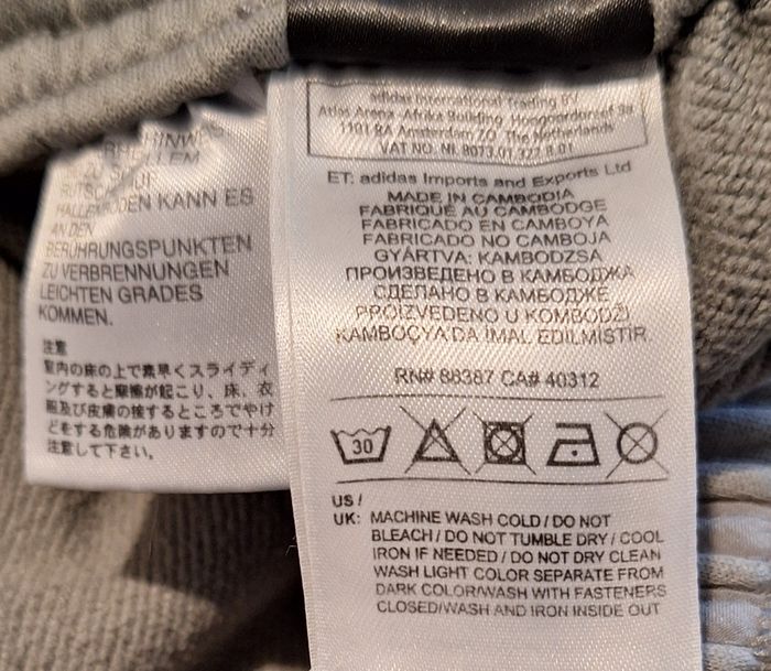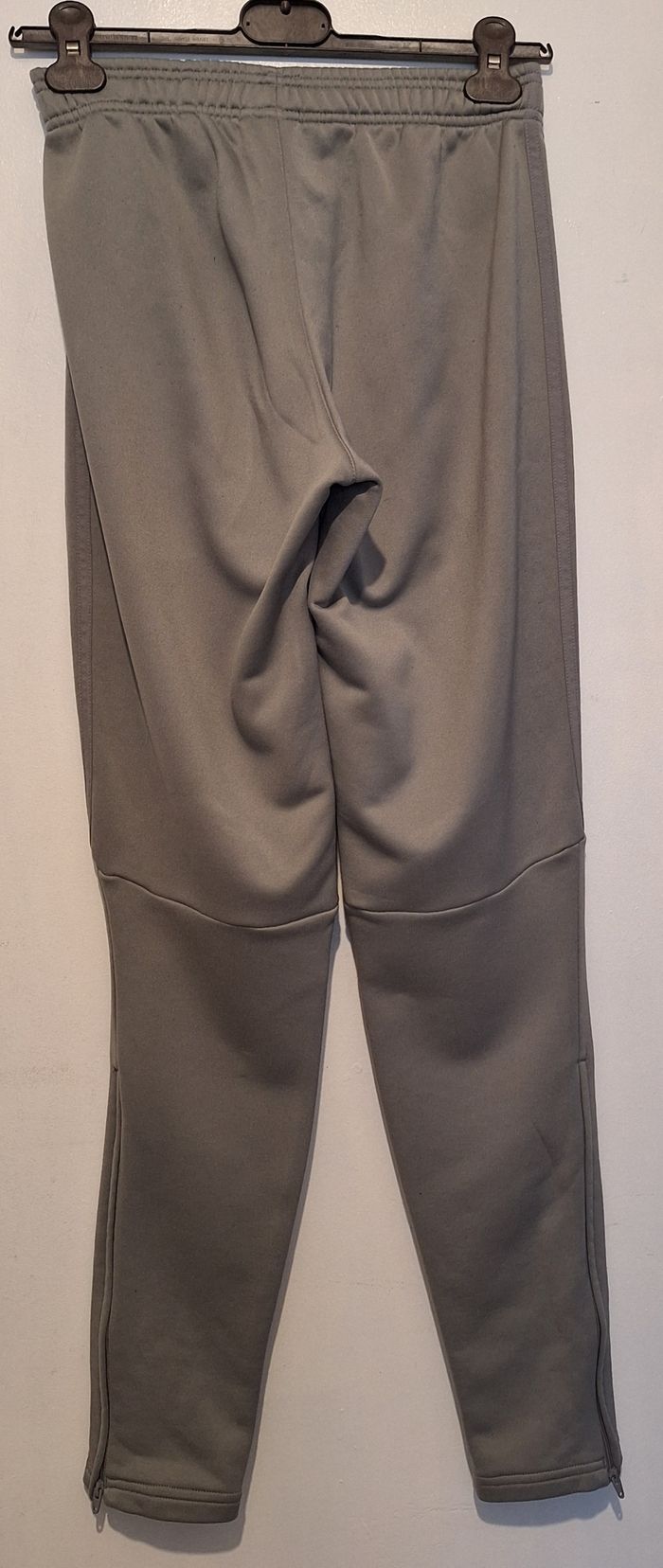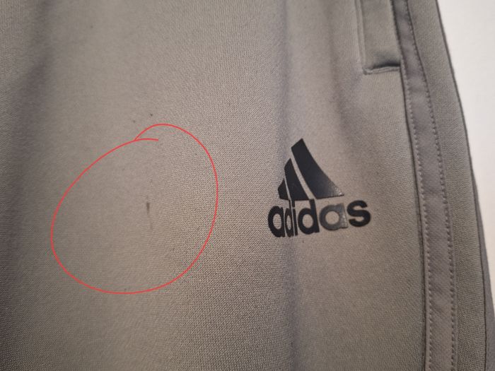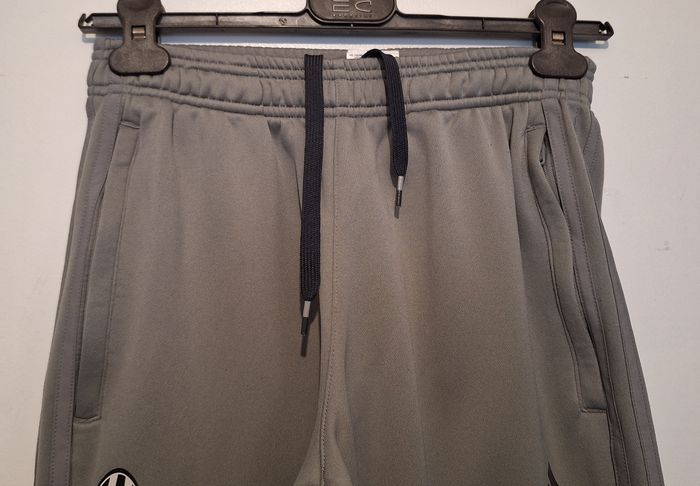 Pantalon de jogging à taille élastiquée avec cordons à nouer, deux poches zippées Genoux marqués par une couture. Chevilles zippées. Imprimé Adidas et Juventus devant sous les poches. Une petite tâche à côté d'Adidas. Quelques bouloches. Polyester 100 %.