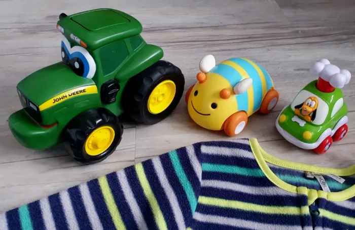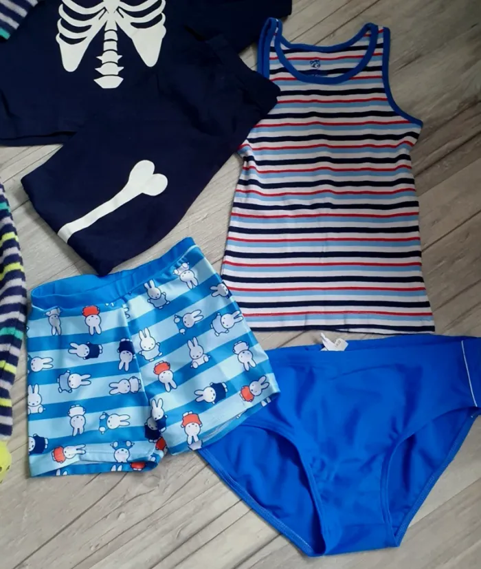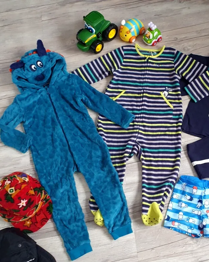 - 1 Beau pyjama garçon de la collection Lupilu de taille inscrit 98/104 - 2/ 4 ans. Couleur marine avec motifs squelette. Matière coton. Entièrement neuf jamais porter. - 1 pyjama 1 pièce velours polaire de la collection In Extenso de taille 3 ans. Couleur bleu. Grand zip devant. En super état. - 1 pyjama 1 pièce polaire de la collection Orchestra de taille 3 ans. Couleur rayé vert pomme, blanc, vert menthe, marine. Grand zip devant. En très bon état. - 1 Débardeur rayé bleu, blanc, rouge, marque Lupilu en super état taille 98/104 - 2 - 4 ans. Matière coton. - 1 Beau maillot de bain garçon ou fille marque Nijntje de taille 98/104 - 3/4 ans. Couleur bleu avec lapin. Comme neuf porter 1 fois. - 1 Casquette polaire couvre oreilles avec Edelweiss T: 53/56 cm, comme neuve. - 1 Casquette noir pour le ski taille 53 cm avec patte coté que vous pouvez relevé ou pas. Comme neuve. - 1 Maillot de bain bleu taille 80 pour un 5 ans (mais ce fier aux mesures). Matière 80% polyamide et 20% élasthanne. Doublé devant et lien pour le resserrer à la taille. Marque Dubois. Taille de 34 cm à plat sans tirer. En très bon état. - 1 gros tracteur John Deere à friction vert de la collection Tomy. Enfonce le bouton sur le toit du tracteur et il avance tout seul sur plusieurs mètres. Il fait 20 cm de long sur 15 cm de haut. En super état pratiquement pas servis. - Lot de deux voitures à friction. Une voiture abeille Skip Hop et une voiture Disney ou il faut appuyer sur l'os pour qu'elle roule toute seule. Les deux sont en super état.