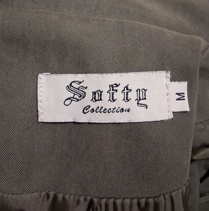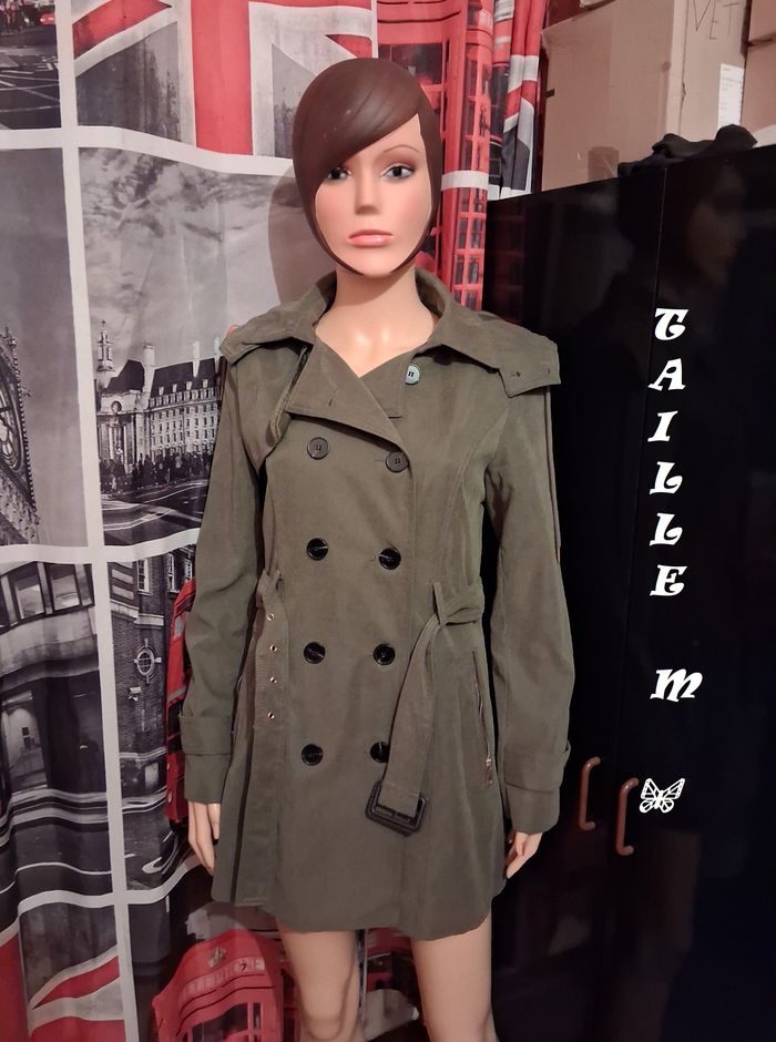 Magnifique trench de couleur kaki avec capuche, deux rangés de boutons plus ceinture, fermeture éclair aux poches, style peau de pêche au touché, excellent état, taille M, marque Softy