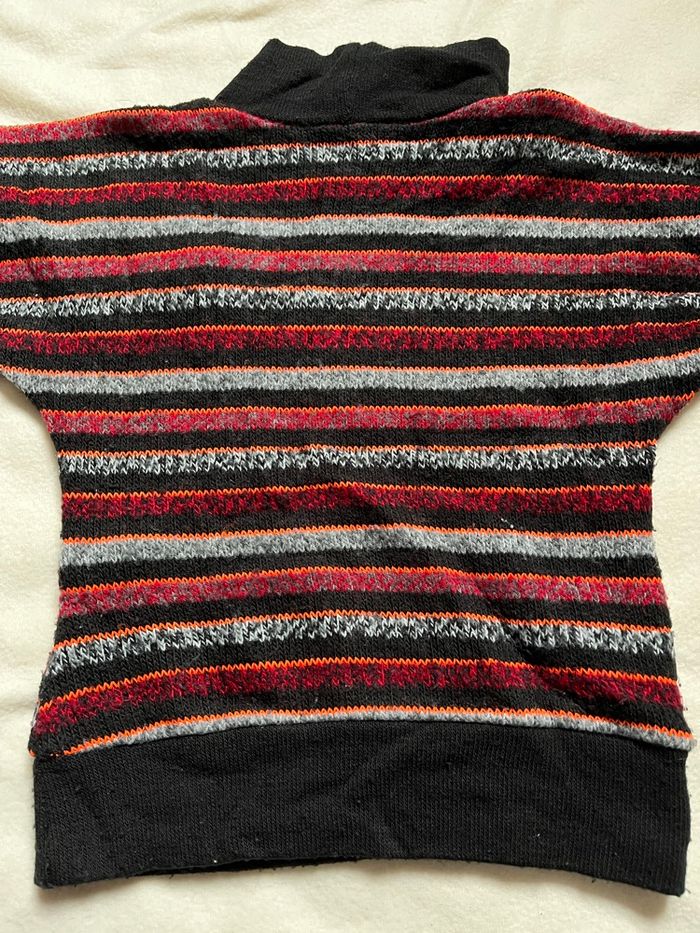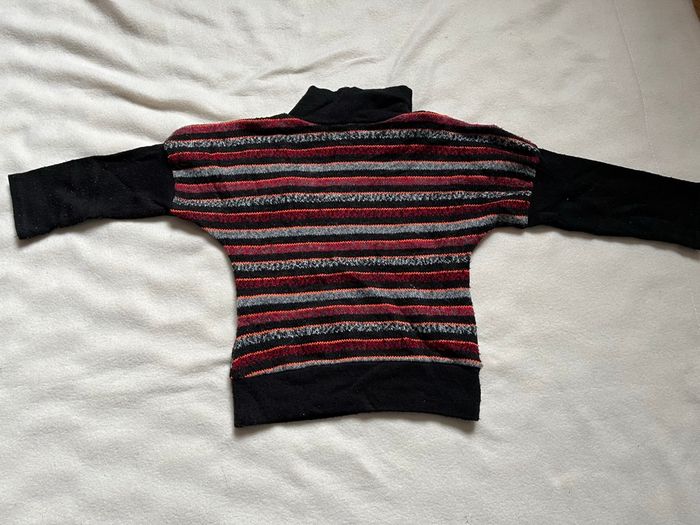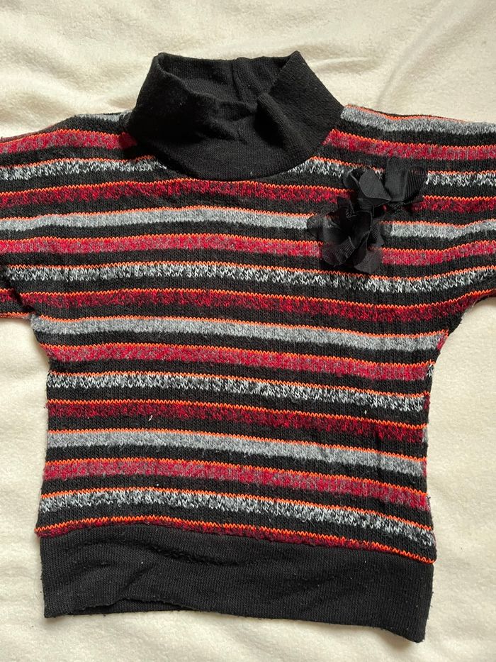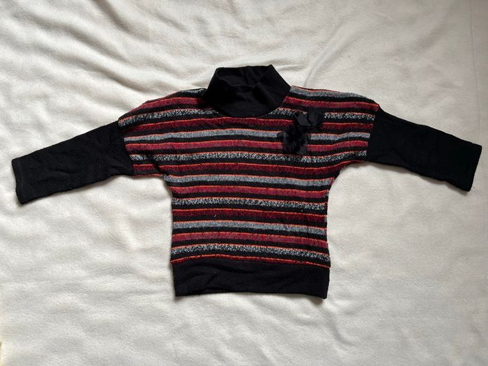 Vends ce Pull en laine avec petite fleur en relief Couleur rayé rouge orange et noir Matière type laine fine taille six ans Demi largeur aux aisselles 29 cm longueur 37 cm 1,5 euros Mes autres annonces De vêtements ou accessoires pour fille de 5 à 6 ans #lma42fille5 #lma42fille6