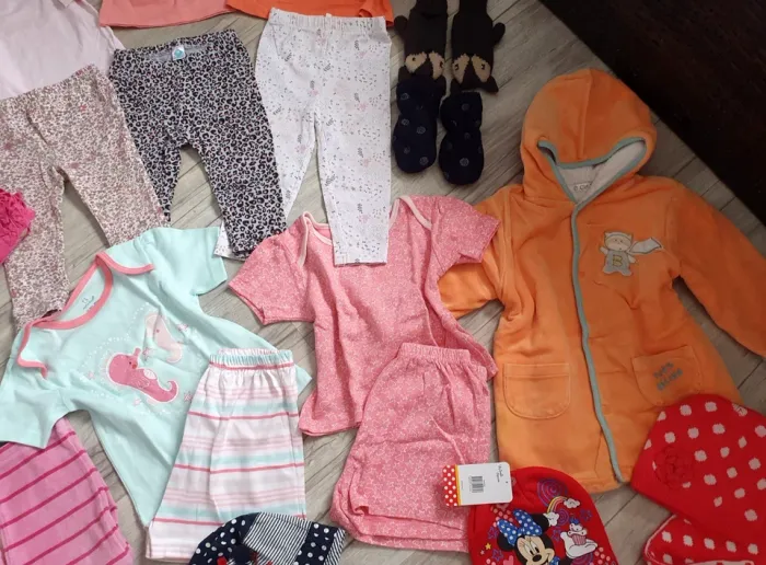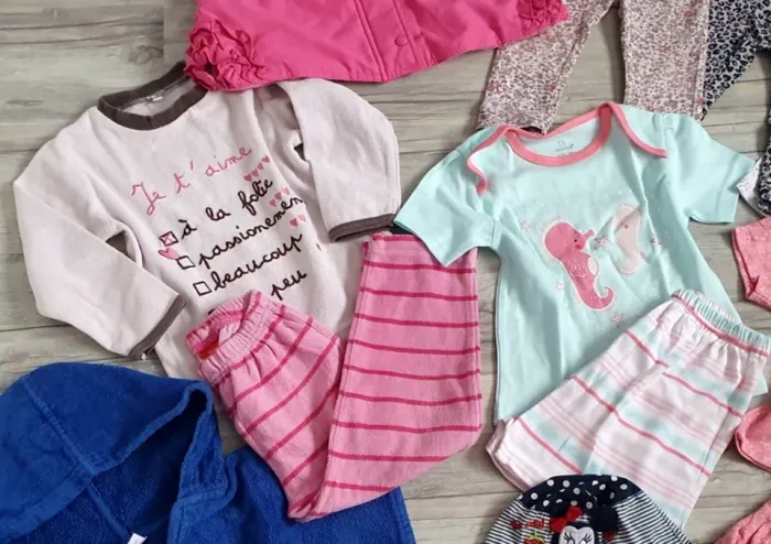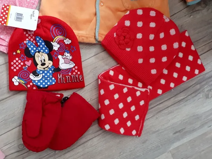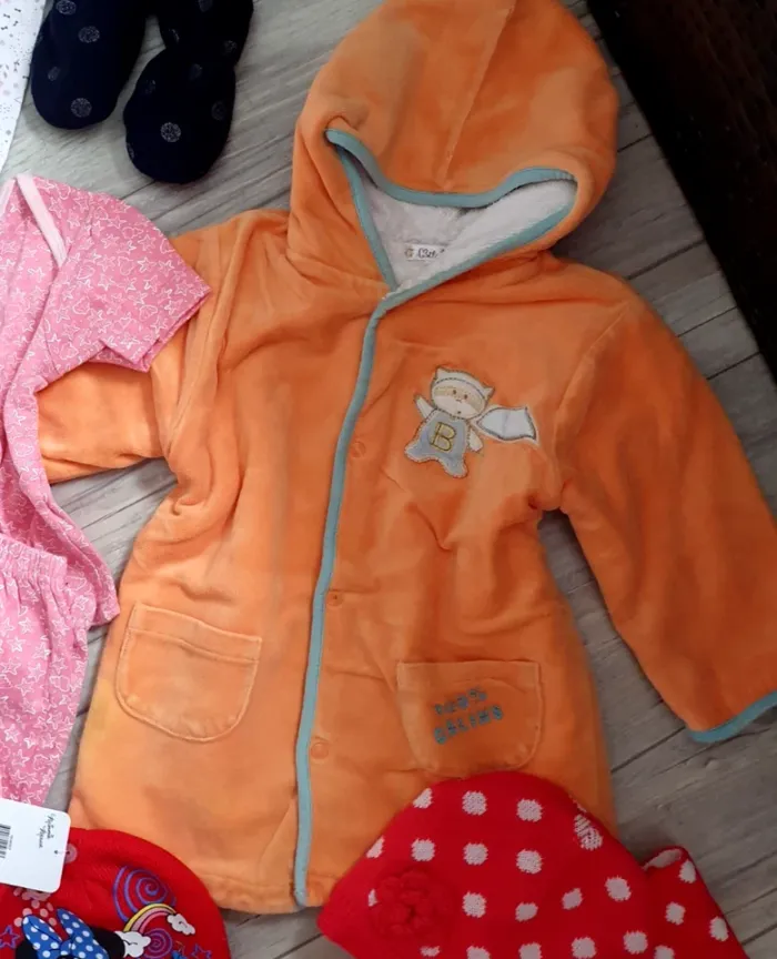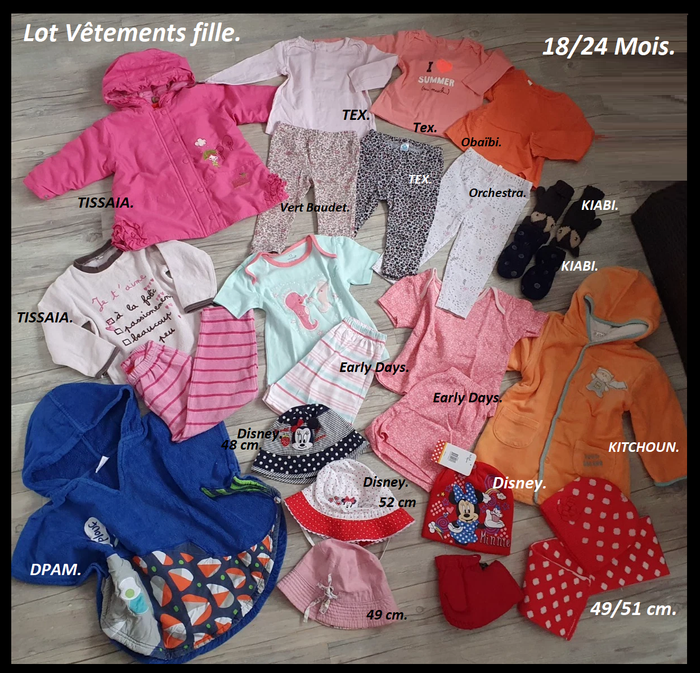 Lot vêtements bébé filles 18/24 mois en très bon état voir certains comme neuf. Voir les photos. _1 manteau brodé, Tissaia, rose pour le printemps ou demi-saison en 18 mois. TBE. _ 3 ensembles legging: 1 legging blanc avec fleurs et étoiles, marque Orchestra, taille 18 mois et T-shirt rose, marque Tex, pressions au dos, taille 18 mois. Le tout en très bon état. _ 1 ensemble legging léopard gris, rose et noir, marque Tex, taille 18 mois et T-shirt corail avec grande fleur coté, marque Obaïbi, taille 18 mois. Le tout en très bon état. _ 1 ensemble legging floral, marque Vert baudet, taille 18 mois et T-shirt rose, marque Baby Tex, pressions au dos, taille 18 mois. Le tout est en très bon état. _ 1 sortie de bain en éponge bien absorbante orange 24 mois. TBE _ 1 sortie de bain forme pancho DPam bleu en éponge taille 12/24 mois. TBE. _ 1 pyjama velours rose Tissaia taille 24 mois. TBE - 1 pyjama short fille 24/36mois Neuf. - 1 pyjama short rose avec étoile T: 98 -24/36 mois. TBE. - 1 Ensemble bonnet et son écharpe T: 49/51 cm - 18/24 mois. TBE. - 1 bonnet rouge Disney, Minnie T: 18/24mois - 52 cm. NEUF. - Deux paires de moufles bébé T: 49 voir 18/24 mois TBE. - 1 paire de moufle gris, renard T: 24-36 mois. TBE. - 1 Chapeau de soleil fille rose 49 cm. TBE. - 1 Bob, chapeau de soleil fille rouge/ blanc Disney 52/53 cm. TBE. - 1 chapeau de soleil fille marine/ blanc Disney 48 cm. TBE.