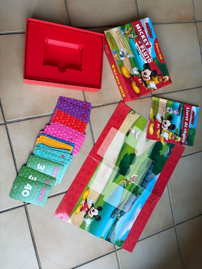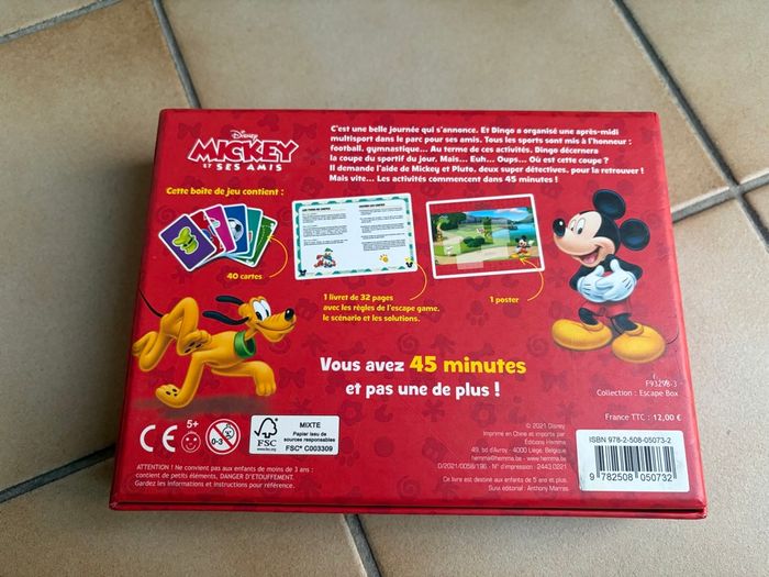 Bonjour, Je vends cette Escape boxe de Mickey et Pluto. Boîte complète en très bon état général. Quelques cartes légèrement abîmées comme le montre la photo mais rien d’embêtant. C’est un mini escape game pour les enfants de plus de 5 ans. Mickey et Pluto doivent aider Dingo à trouver la coupe du sportif qu’il a égaré. - 1 livret avec les règles, le scénario et les solutions - 40 cartes - 1 poster Durée d’environ 45 minutes
