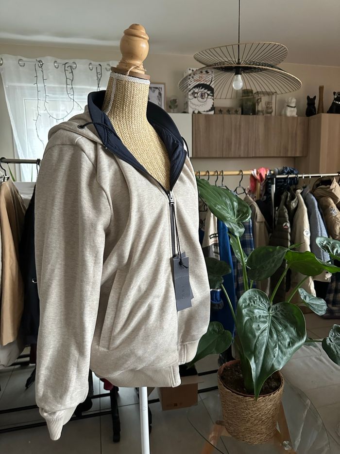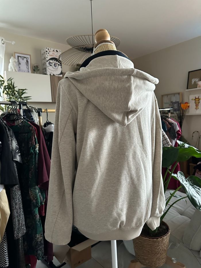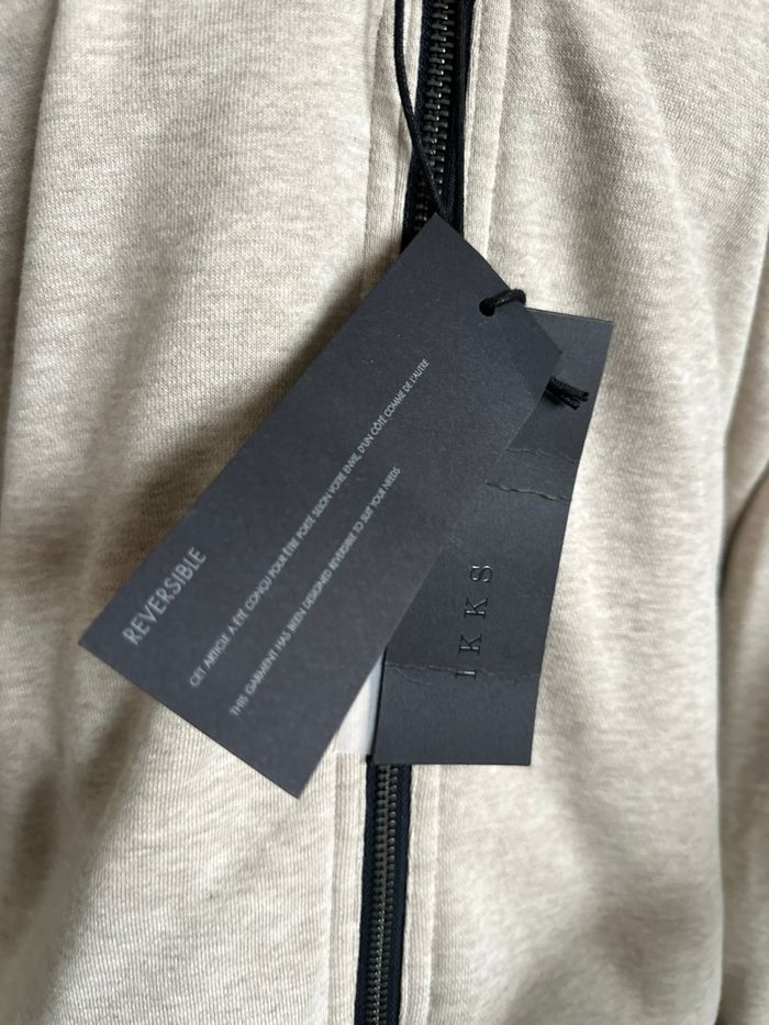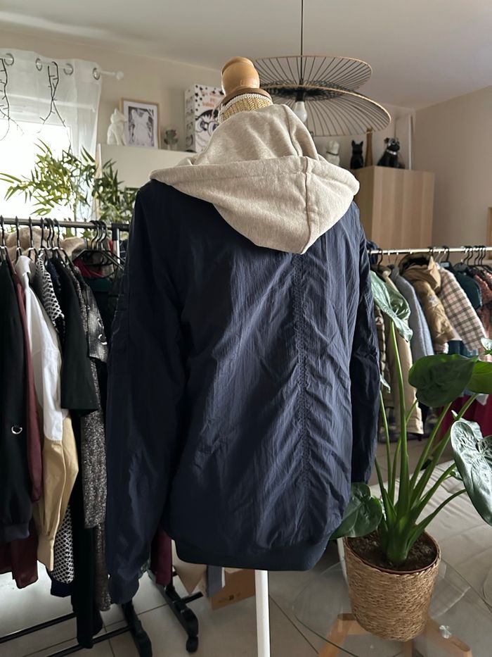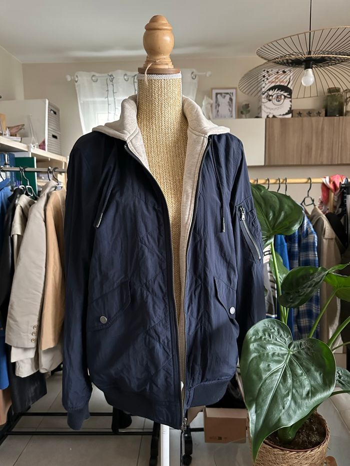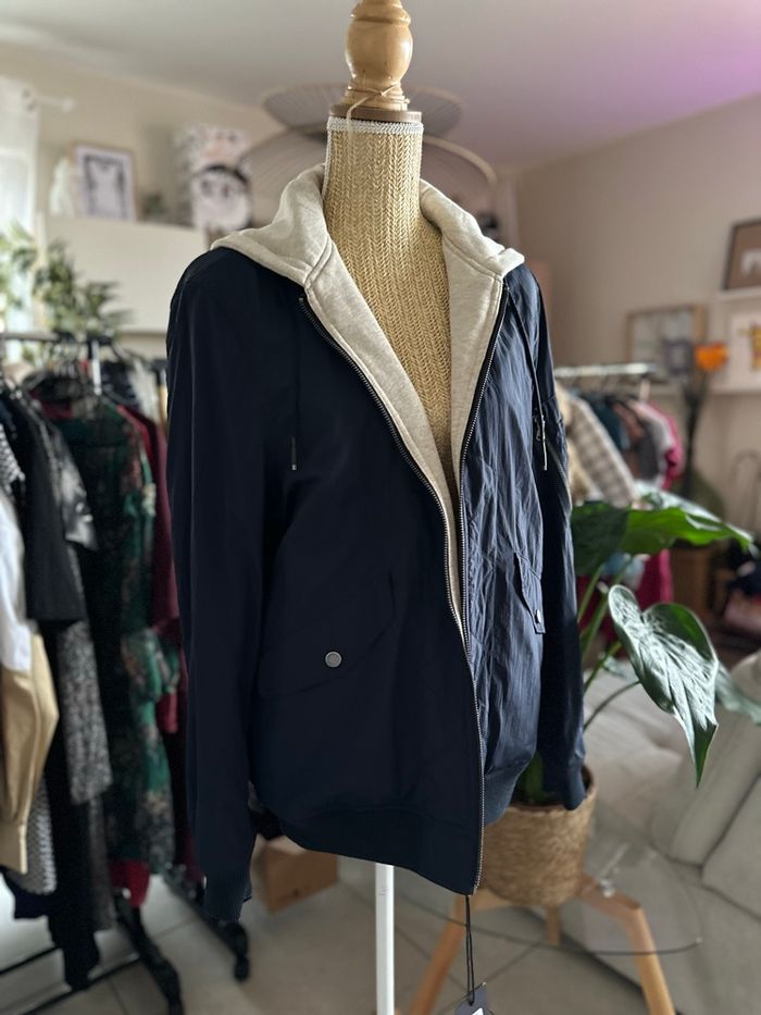 Bomber IKKS réversible : • côté marine style bomber • côté gris clair style sweat à capuche Fermeture zippée, poches, coupe confortable. Deux vestes en une, idéale mi-saison. 📌 État : neuf avec étiquette