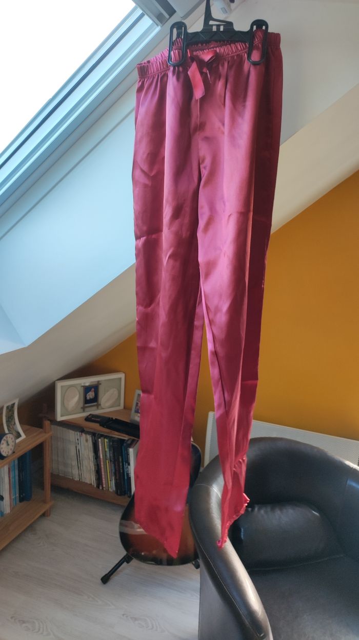 Je vends ces bas de pyjama en satin de couleur rouge. - Type de produit : Bas de pyjama - Taille : 36 - S - Couleur : Rouge / Bordeaux - Matière : polyester - Caractéristiques : Taille élastique N'hésitez pas à me contacter pour plus d'informations ou de photos.