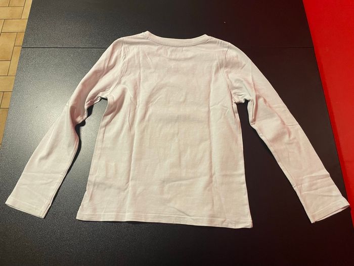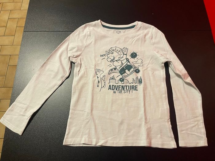 T-shirt blanc à manches longues en coton, taille 8 ans. Motif dinosaure 🦕 amusant, parfait pour un look confortable et ludique. Très bon état, avec étiquettes de marque et de taille. #garcon8ans #mancheslongues #tshirtgarcon #dinosaure #tshirtdinosaure #tshirtgarcon