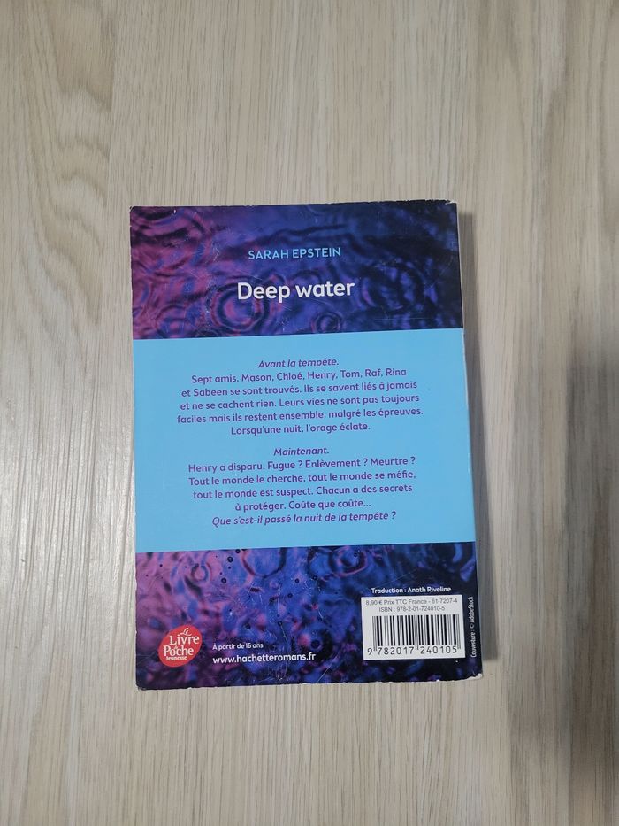Thriller psychologique "Deep Water" de Sarah Epstein. Le livre est en très bon état général. C'est une histoire de suspense recommandée à partir de 16 ans. Ne pas hésitez si vous avez des questions 😊 Possibilités de lot, voir le dressing. #deepwater #sarahepstein #thriller #livredepoche #lectureados #suspense #livreoccasion