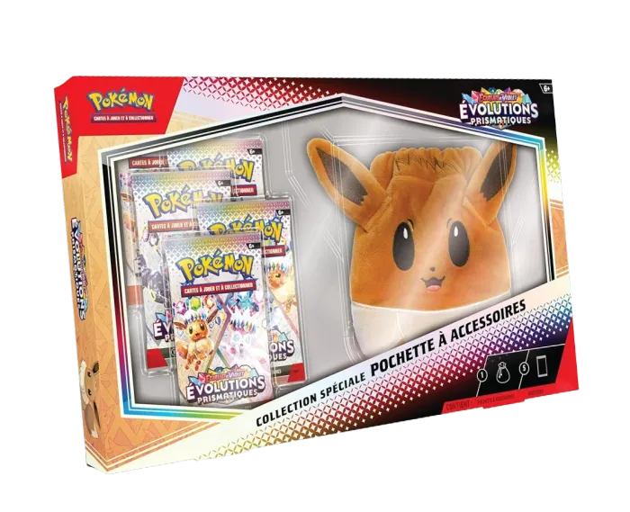 🟧 Coffret Collection Pochette à accessoires EV8.5 – Évolutions Prismatiques Édition Française – Sortie le 25/04/2025 Un coffret original qui combine collection et praticité : une jolie pochette illustrée d’Évoli souriant, accompagnée de 5 boosters de l’extension EV8.5 – Évolutions Prismatiques. Un produit idéal pour les jeunes dresseurs ou les fans d’Évoli, le Pokémon le plus attachant de Kanto. 📦 Contenu du coffret : • 5 boosters EV8.5 – Évolutions Prismatiques • 1 pochette à accessoires exclusive Évoli ℹ️ Informations complémentaires : • Langue : Français • Date de sortie : 25/04/2025 • État : Neuf – Produit officiel Pokémon ⚠️ Sécurité : Ne convient pas aux enfants de moins de 36 mois (petits éléments).