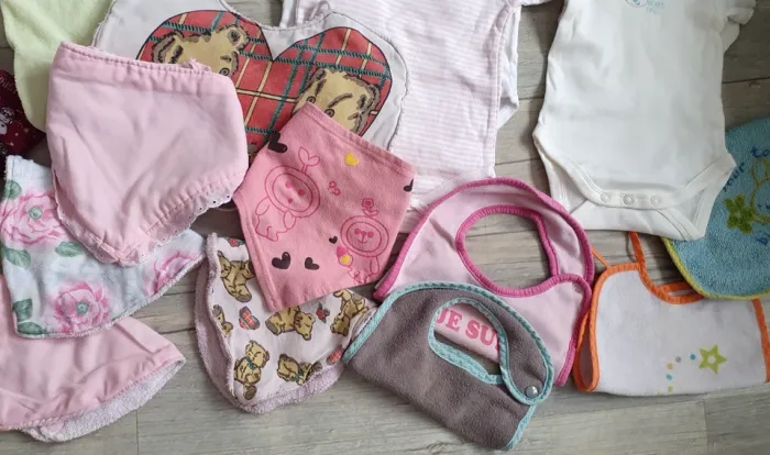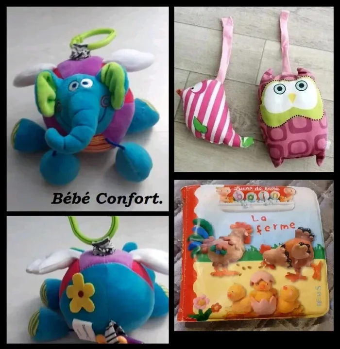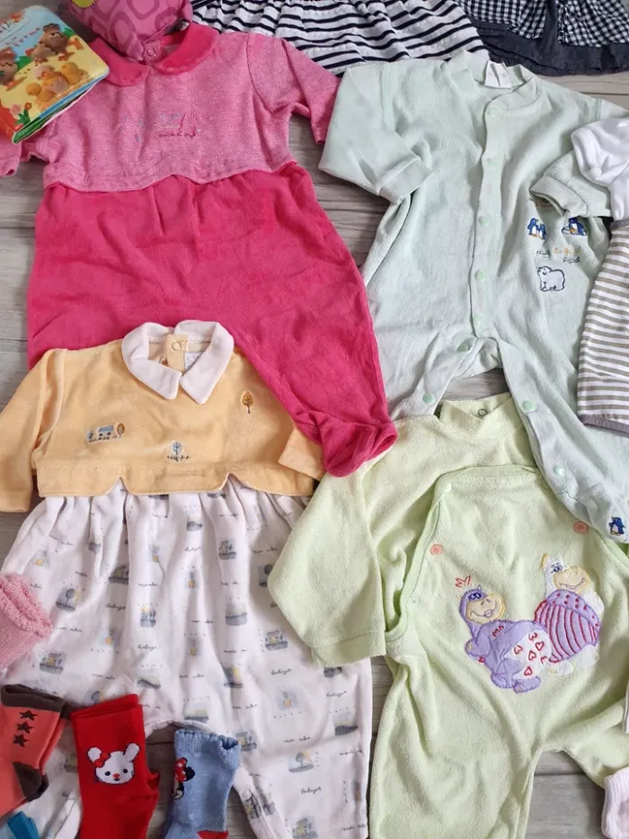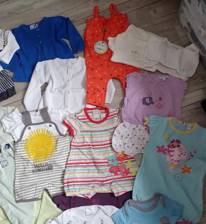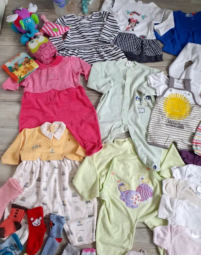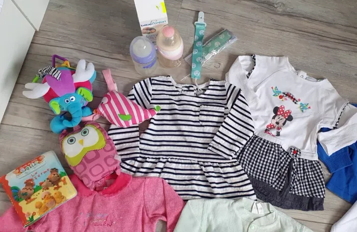 La plus part des vêtements sont neuf à comme neuf. _1 robe Orchestra, manches longues, motifs Disney en 9 mois. TBE _1 Robe rayé Primark, manches longues, marine/blanc en 6 - 9 mois - 74 cm. TBE. _2 gilets en 6 mois, 1 bleu Tissaia + 1 Blanc Baby Club. TBE. _ 4 pyjamas velours en 6 mois. 1 Sucre d'Orge fuchsia, 1 Berlingot velours jaune, 1 velours vert menthe avec pingouins, 1 vert clair avec dinosaures. Tous en TBE. _ 5 bodies 6 mois à manches courtes. 1 mauve Absorba en TBE, 1 blanc avec lapins en TBE, 1 rayé rose en TBE, 1 rayé blanc / beige, en TBE, 1 blanc Sucre d'Orge en TBE. Toutes les pressions sont ok pour les 5 bodies. -Lot de 3 barboteuses taille 3 mois, ouverture a pressions à l'entrejambe pour faciliter les changes. Marque Kimbaloo, Orchestra. Neuves et comme neuf. - 1 ensemble salopette taille 3 mois. Mes petits cailloux. Neuf - 3 bodies à manches courtes taille 3 mois. Neuf - 1 ensemble barboteuse rayé taille 3 mois. Neuf - Lot de 13 paires de chaussettes. TBE. - Lot de 10 bavoirs dont 5 en pointes et 5 base forme ronde. TBE - Lot de deux biberons, Lansinoh et bébé confort. TBE. - Lot 3 peluches à suspendre dont un avec grelot + livre de bain. TBE - Lot de 2 attaches tétines ou sucettes ou pour attacher son doudou dans la poussettes pour pas le perdre. Lavable en machine de couleur vert lagon, un neuf et un comme neuf.
