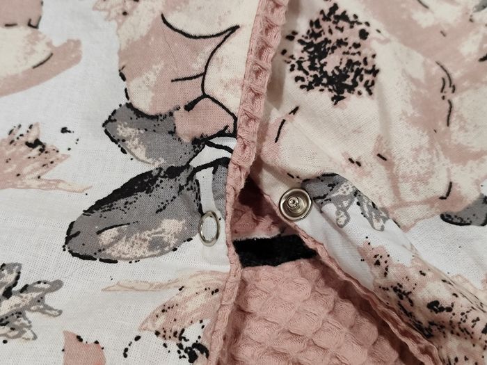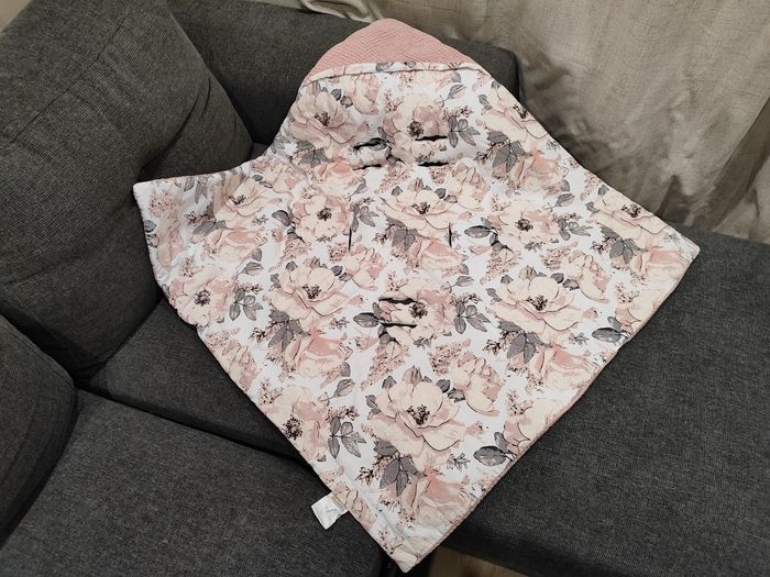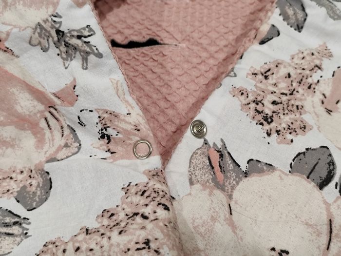 Magnifique nid d'ange rose poudré et liberty TOTSY BABY. Neuf sans l'étiquette, aucun défaut, état impeccable. Capuche et passage pour les sangles du siège auto. Pressions permettant de bien emmitoufler bébé. En coton gaufré. Dimensions : 90x90cm.