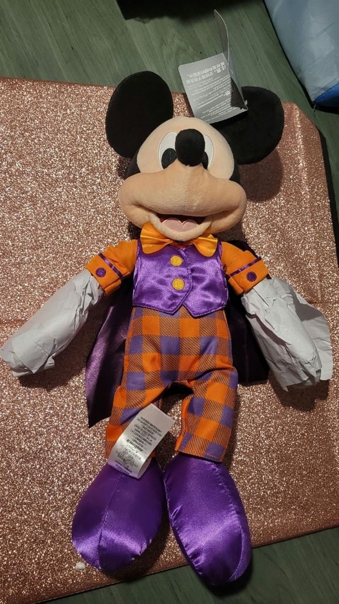 Peluche de Mickey halloween 45 cm neuve conservée à l'abri de la lumière et poussière vendue dans son sachet d'origine et étiquette. Envoi rapide et protégé avec soin