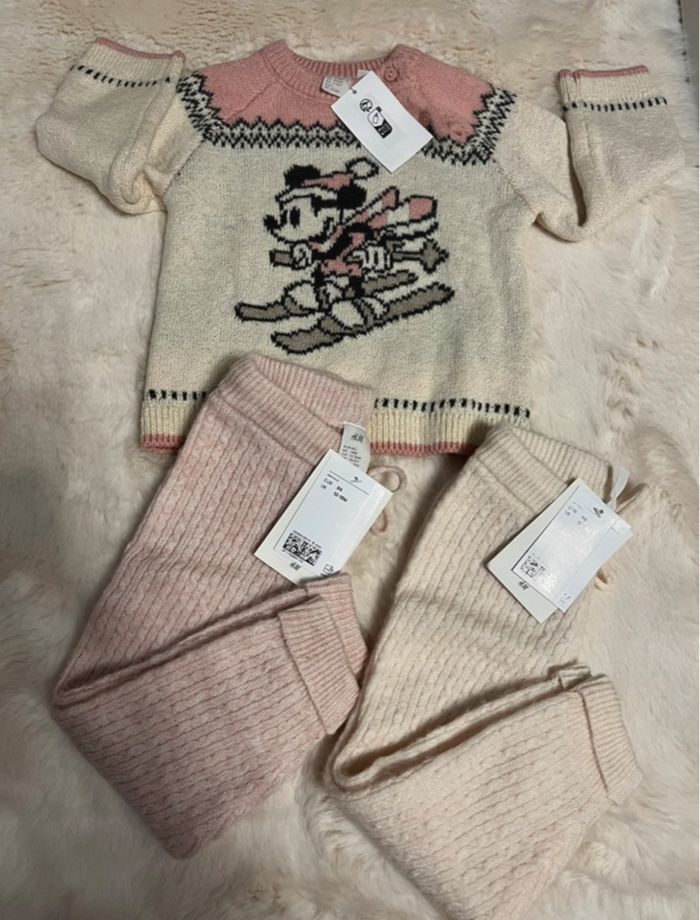 L’ensemble comporte un pull en maille douce imprimée Minnie 80 cm et 2 pantalons 86 cm (acrylique +polyester) Tout est neuf avec étiquette