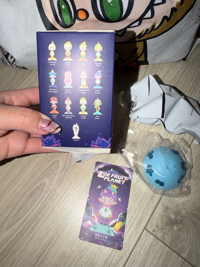 Popmart Zoé fruit planet - grape Uranus Issu du lucky bag popmart via boutique officielle popmart Ali express Je revends ce que je ne garde pas du lucky bag Ouvert par le bas Sachet scellé Authentique 100% Facture à l’appui en photo