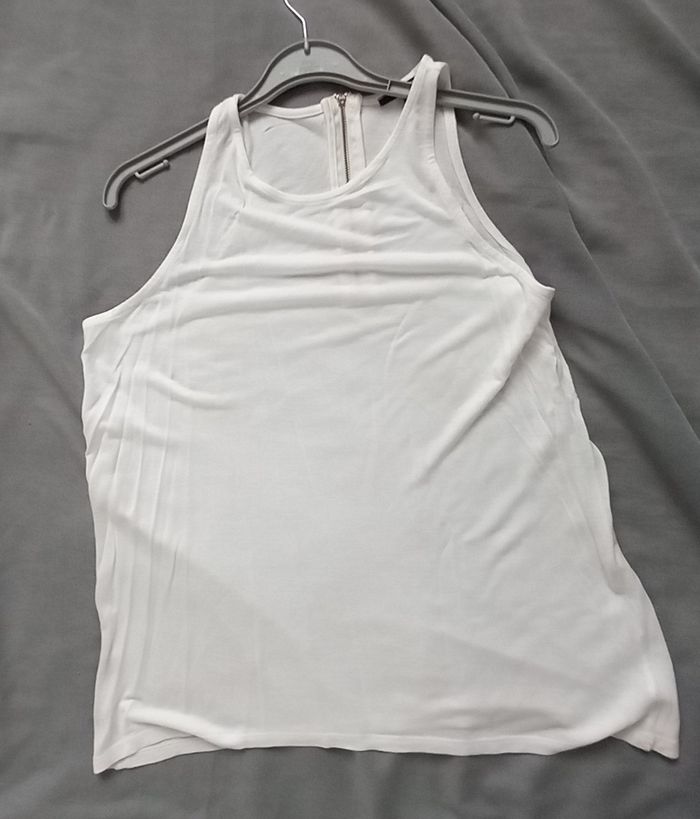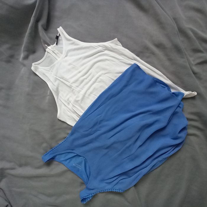 - Top Kiabi, col rond, coloris blanc, bas large, Zip, taille 38-40 étiquette de composition coupée, largeur aisselles 52 cm longueur épaule-bas = 65 cm et aisselle-bas = 46 cm - Top Camaieu, col rond, jolies broderies sur épaules, composition dos 93% viscose 7% élasthanne - devant 100% polyester, coloris bleu, largeur aisselles 46 cm, longueur épaule-bas = 62 cm et aisselle-bas = 34 cm envoi rapide et soigné possibilité de faire une offre en lots
