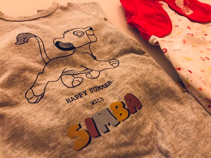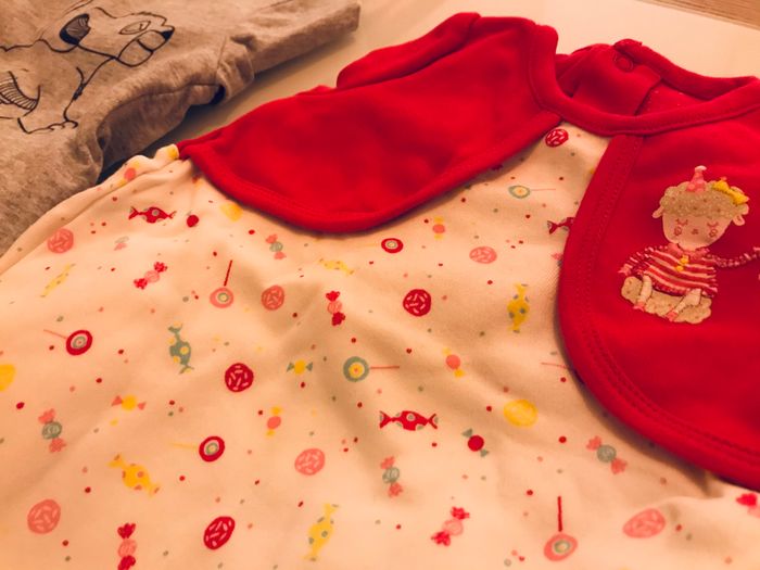 1 pyjama gris Simba - ouverture et fermeture dos, 1 pyjama bi-color blanc / rose motifs bonbons - ouverture et fermeture dos.