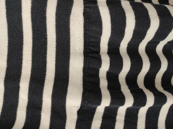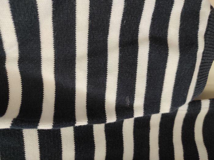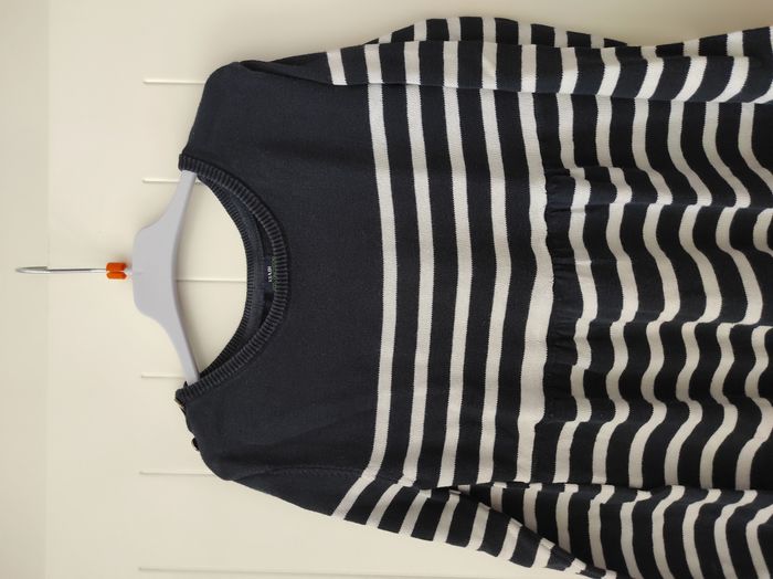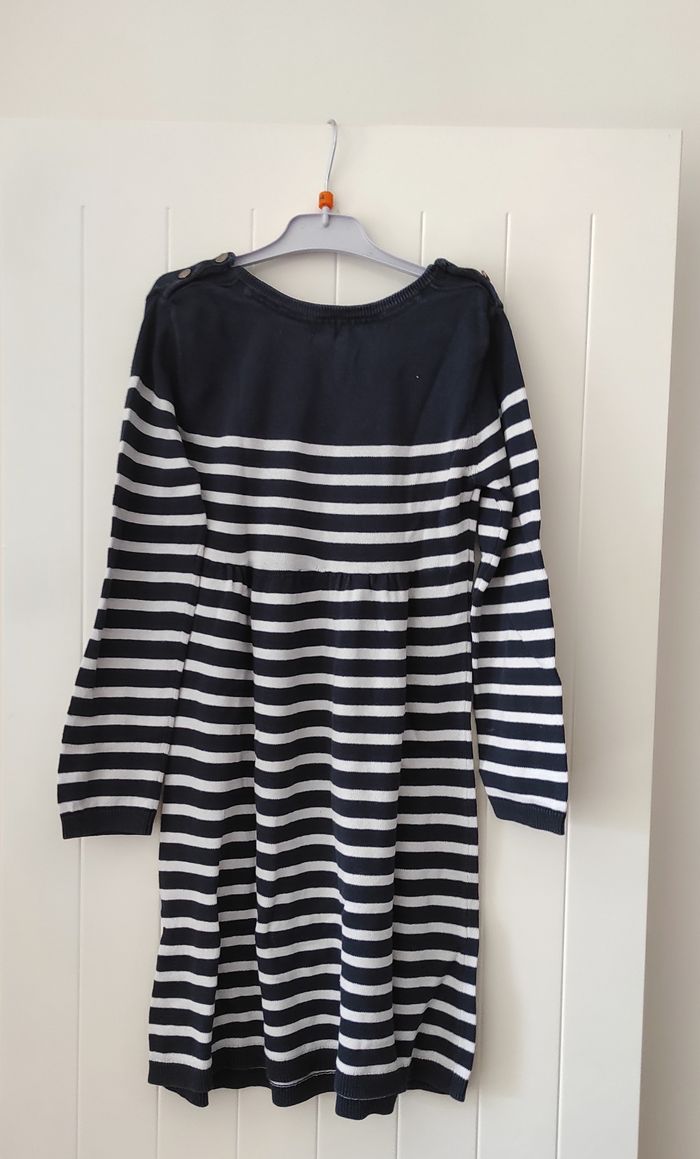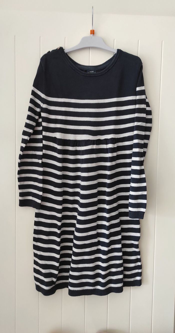 "Robe pull à manches longues pour fille, taille 8 ans. Motif rayures, coloris bleu et blanc. Deux boutons décoratifs sur l’épaule, jolis détails qui apportent du style. ⚠️ Défauts à signaler (voir photos) : Un petit défaut de couture entre le haut et le bas de la robe sur le devant Une petite tache de feutre à l’arrière, en bas de la manche droite ➡️ Malgré cela, la robe reste en bon état général, encore portable et confortable."